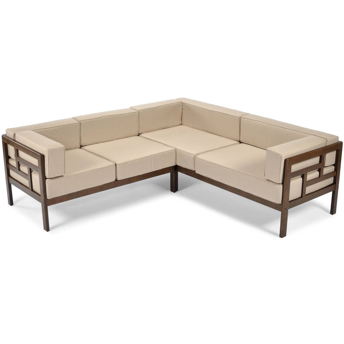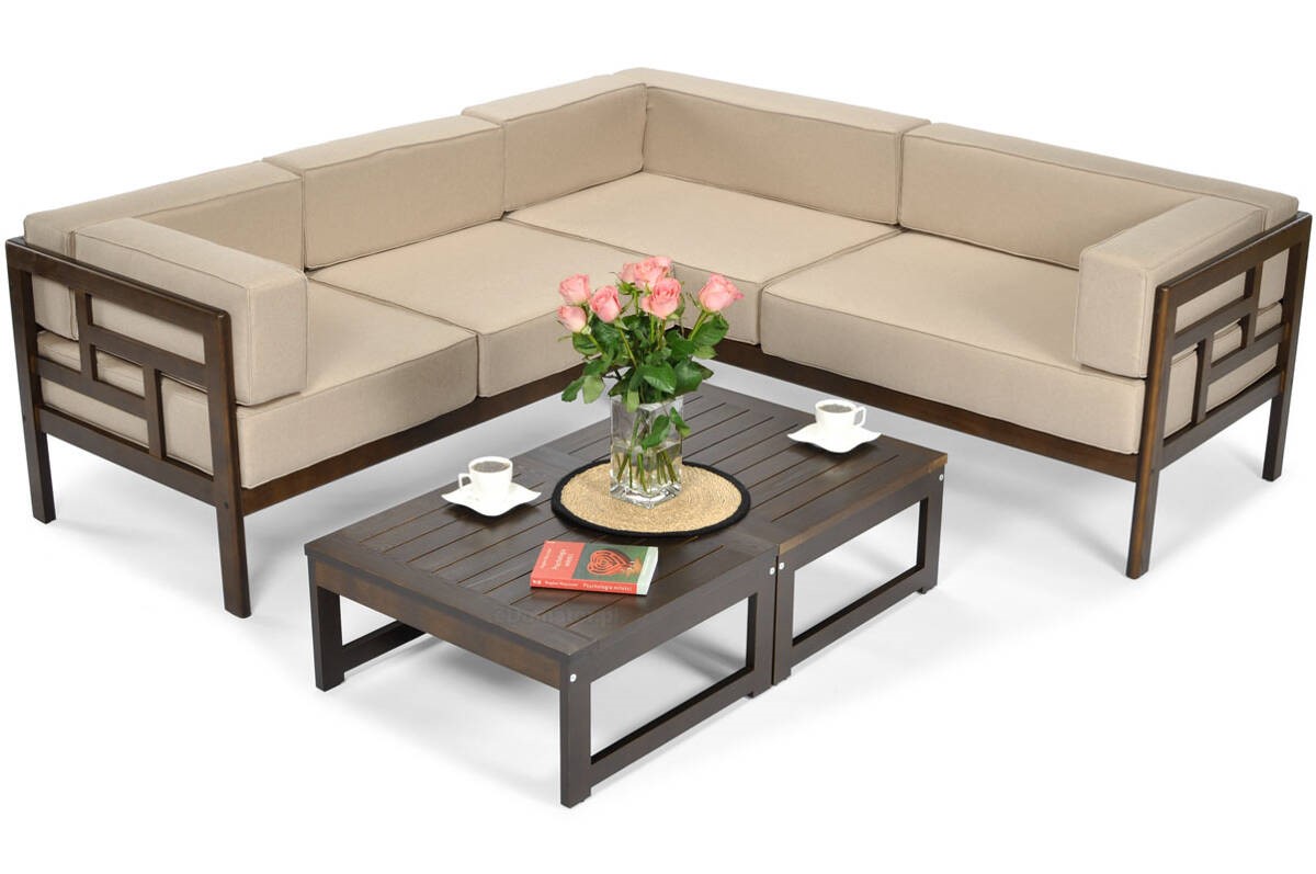 Narożnik ogrodowy "Eden" dla 5 osób w kolorach brązowym i beżowym to wygodny i funkcjonalny zestaw idealny do użytku na zewnątrz. Składa się z modułowych części, które można dowolnie konfigurować, w tym wygodnych kanap i stolika. Zestaw pokryty jest trwałymi, odpornymi na warunki atmosferyczne materiałami, co czyni go doskonałym wyborem na taras, do ogrodu lub na patio. Beżowe poduszki dodają elegancji i komfortu, a brązowa rama harmonijnie wpisuje się w przyrodnicze otoczenie.