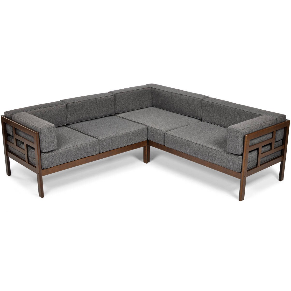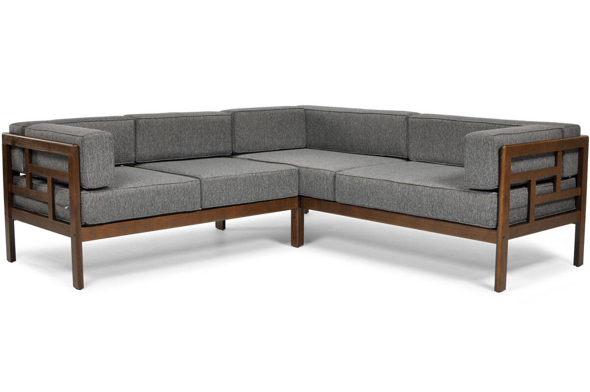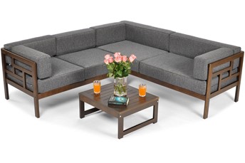 Narożnik ogrodowy "Eden" dla 5 osób w kolorach brązowym i grafitowym to wygodny i funkcjonalny zestaw idealny do użytku na zewnątrz. Składa się z modułowych części, które można dowolnie konfigurować, w tym wygodnych kanap i stolika. Zestaw pokryty jest trwałymi, odpornymi na warunki atmosferyczne materiałami, co czyni go doskonałym wyborem na taras, do ogrodu lub na patio. Beżowe poduszki dodają elegancji i komfortu, a brązowa rama harmonijnie wpisuje się w przyrodnicze otoczenie.