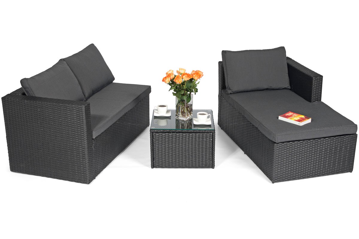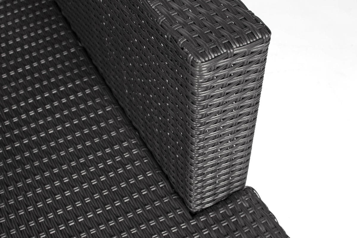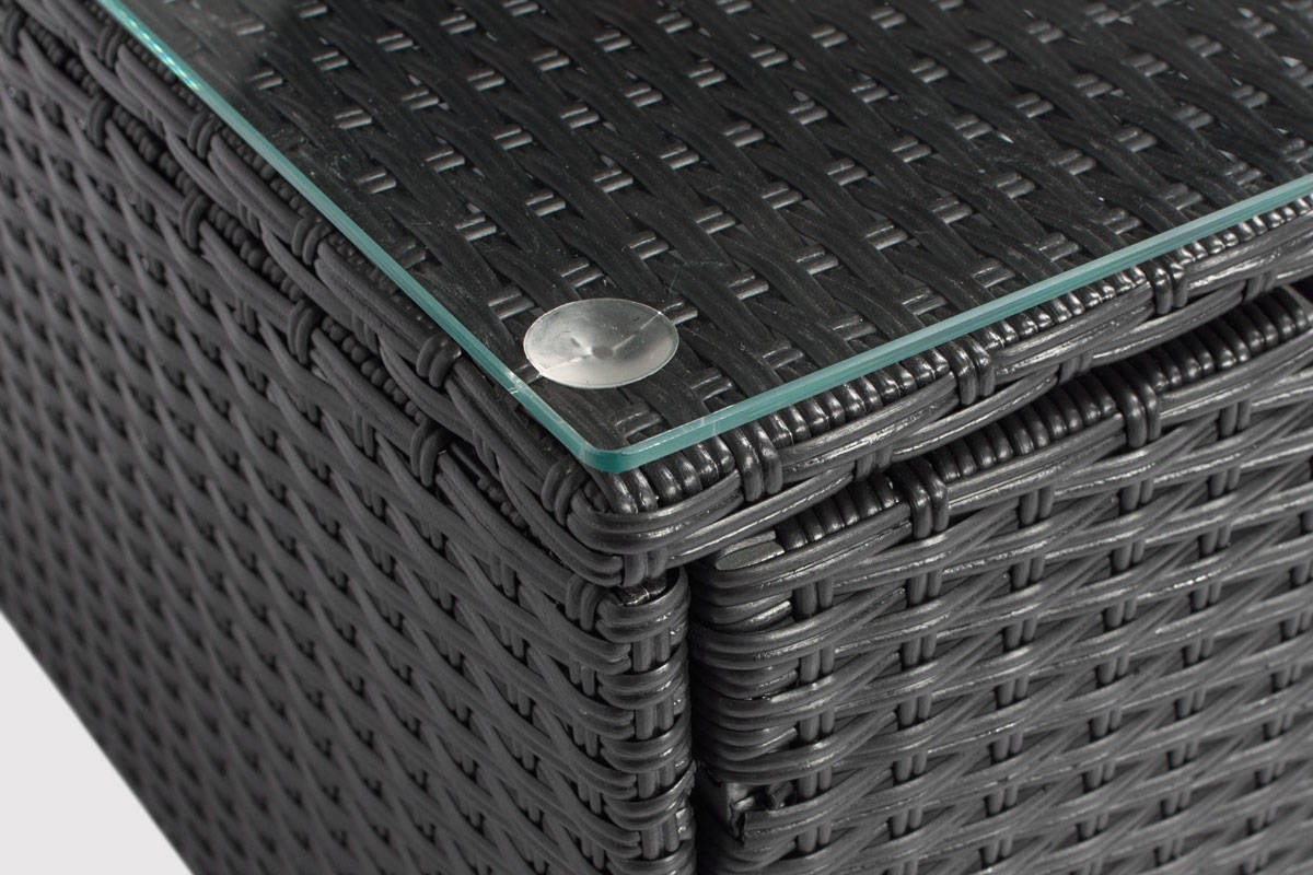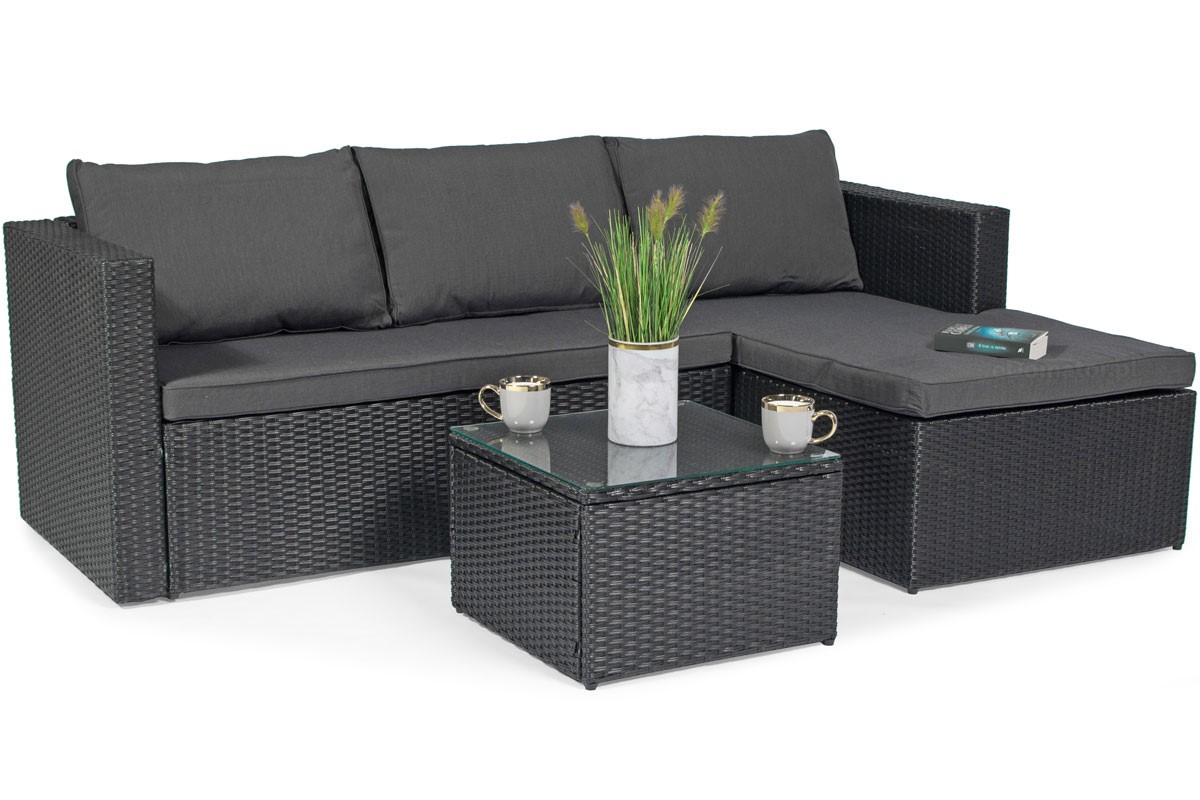 Narożnik ogrodowy ROMA Techno Rattan 4-osobowy, prawy, czarny Zestaw narożnikowy ROMA to wysokiej jakości meble ogrodowe wykonane z eleganckiego czarnego technorattanu. Narożniki świetnie sprawdzają się na tarasach i dużych balkonach, pozwalając maksymalnie wykorzystać dostępną przestrzeń. Konstrukcja mebla wykonana jest ze stali, dzięki czemu jest bardzo solidna i stabilna. Narożnik udźwignie do 400 kg, a stół do 15 kg. Stalowa rama jest owinięta rattanem techno (tworzywem sztucznym podobnym do naturalnego rattanu). Techno Rattan to niezwykle trwały materiał o dużej odporności na warunki atmosferyczne, temperaturę i promieniowanie UV. Idealnie nadaje się do użytku na zewnątrz i dlatego jest często wykorzystywany przy produkcji mebli ogrodowych. Co więcej, wygląda bardzo estetycznie i doskonale wpisuje się w minimalistyczną bryłę mebli ROMA.