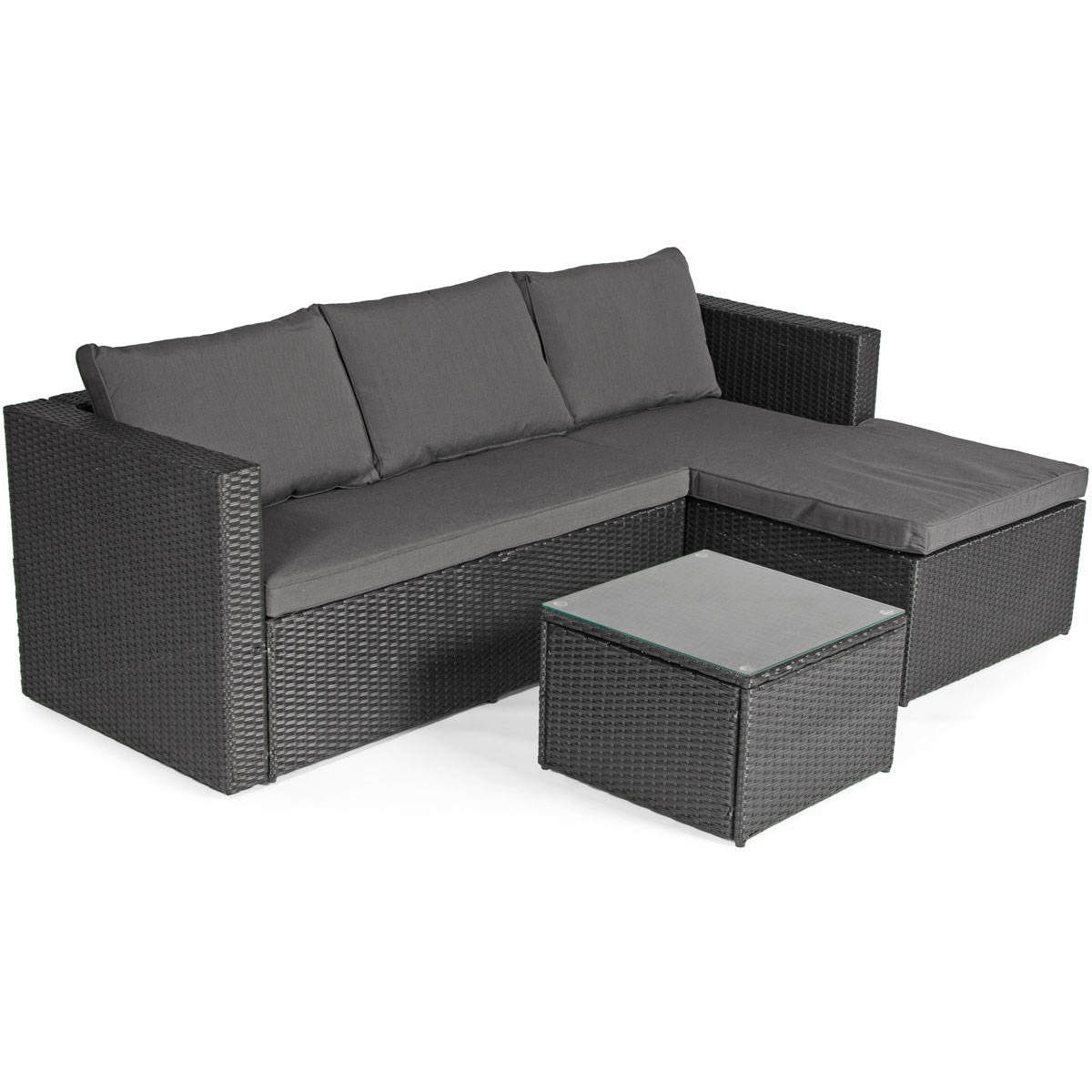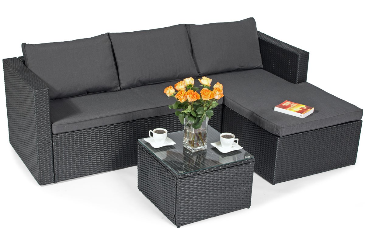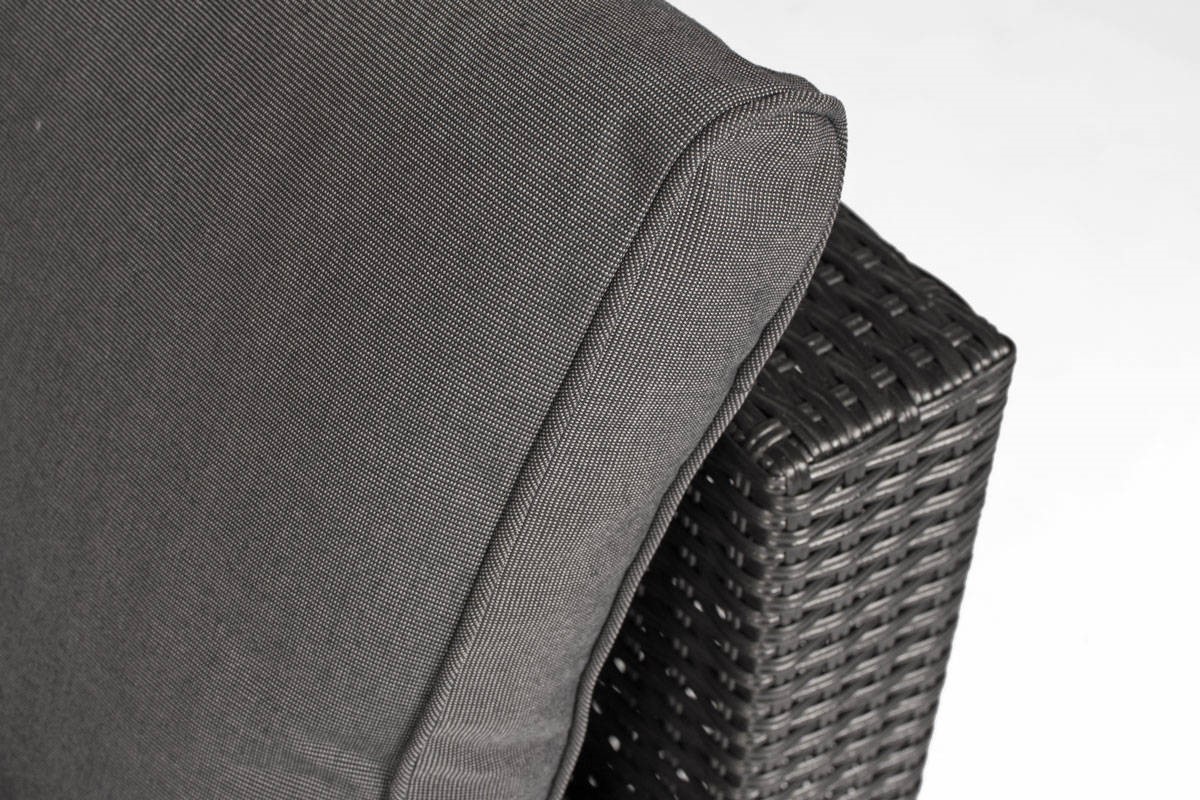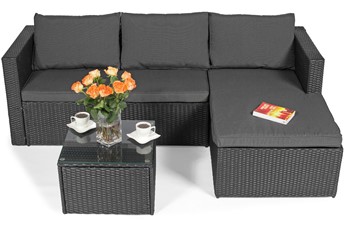 Narożnik ogrodowy ROMA Techno Rattan 4-osobowy, prawy, czarny Zestaw narożnikowy ROMA to wysokiej jakości meble ogrodowe wykonane z eleganckiego czarnego technorattanu. Narożniki świetnie sprawdzają się na tarasach i dużych balkonach, pozwalając maksymalnie wykorzystać dostępną przestrzeń. Konstrukcja mebla wykonana jest ze stali, dzięki czemu jest bardzo solidna i stabilna. Narożnik udźwignie do 400 kg, a stół do 15 kg. Stalowa rama jest owinięta rattanem techno (tworzywem sztucznym podobnym do naturalnego rattanu). Techno Rattan to niezwykle trwały materiał o dużej odporności na warunki atmosferyczne, temperaturę i promieniowanie UV. Idealnie nadaje się do użytku na zewnątrz i dlatego jest często wykorzystywany przy produkcji mebli ogrodowych. Co więcej, wygląda bardzo estetycznie i doskonale wpisuje się w minimalistyczną bryłę mebli ROMA.