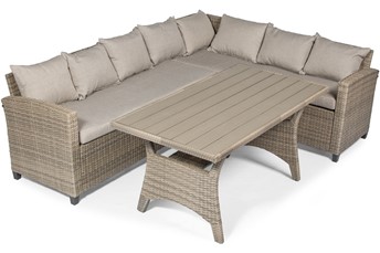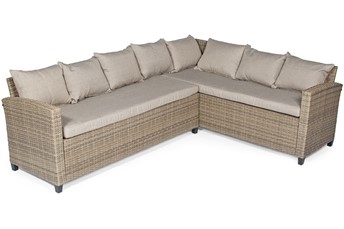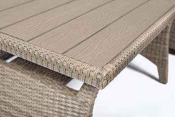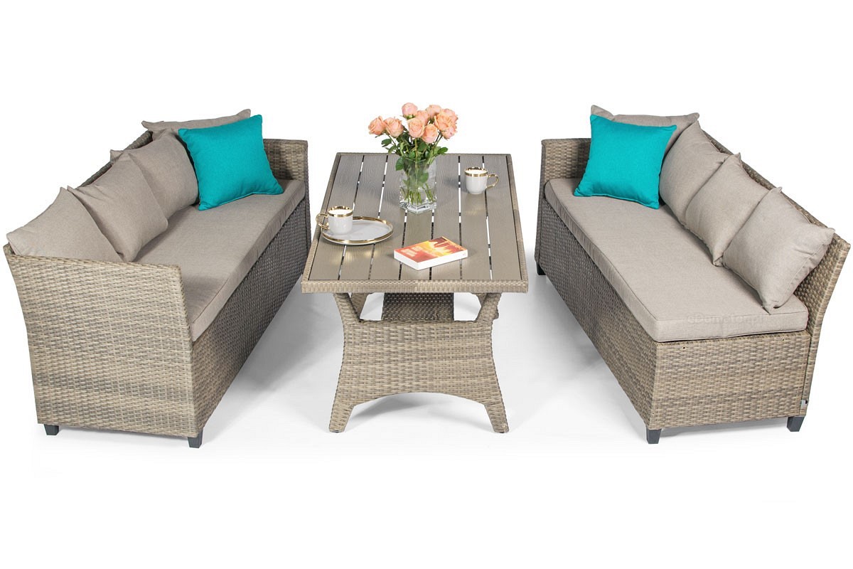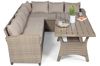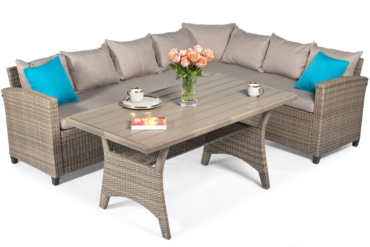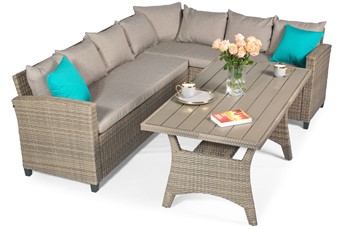 Elegancki ogród STOCKHOLM to idealny mebel na taras lub duży balkon. Uniwersalny narożnik można ustawić po lewej lub prawej stronie, a wysoki stolik przyda się podczas przyjęć. Piękny komplet z wysokiej jakości rattanu. Meble ogrodowe są trwałe i stabilne dzięki mocnej metalowej konstrukcji, seria jest bardzo wytrzymała i doskonale nadaje się do użytku na zewnątrz. Modułowe meble ogrodowe z syntetycznego rattanu, narożna sofa i stół z płyty poliwood. Praktyczny zestaw jadalniany do ogrodu z dużym stołem jadalnym i narożną sofą z poduszkami na siedzisko i oparcie. Narożnik można podzielić na dwa 3-osobowe, a układ kanapy dostosować do dostępnej przestrzeni.