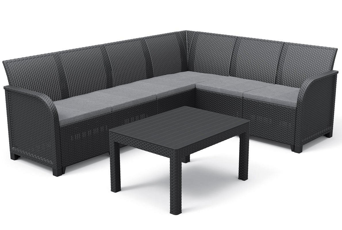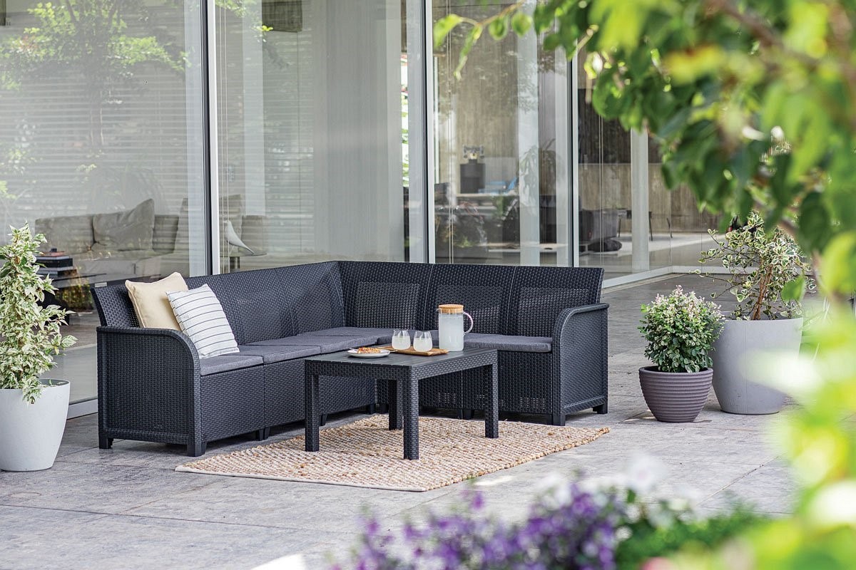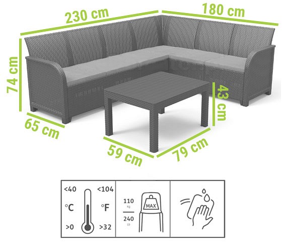 Duży narożnik ogrodowy ROSALIE dla 6 osób ze stołem ORLANDO o wymiarach 79 x 59 x 43 cm. Zestaw ROSALIE składa się z dużego narożnika z poduszkami na siedziska oraz ławki ogrodowej. Przeznaczony jest dla sześciu osób, więc sprawdzi się na większym balkonie, patio czy tarasie. Wygodny narożnik o wymiarach 230 x 180 x 74 cm jest idealny do wypoczynku, imprezowania, a nawet krótkich drzemek na świeżym powietrzu. Zestaw wykonany jest z tworzywa imitującego strukturę mebli z naturalnego rattanu. Materiał jest bardzo wytrzymały i odporny na warunki atmosferyczne oraz promieniowanie UV. Zestaw można użytkować na zewnątrz, mocna konstrukcja wytrzymuje obciążenie do 110 kg na osobę, na stole możemy postawić przedmioty o wadze do 50 kg.