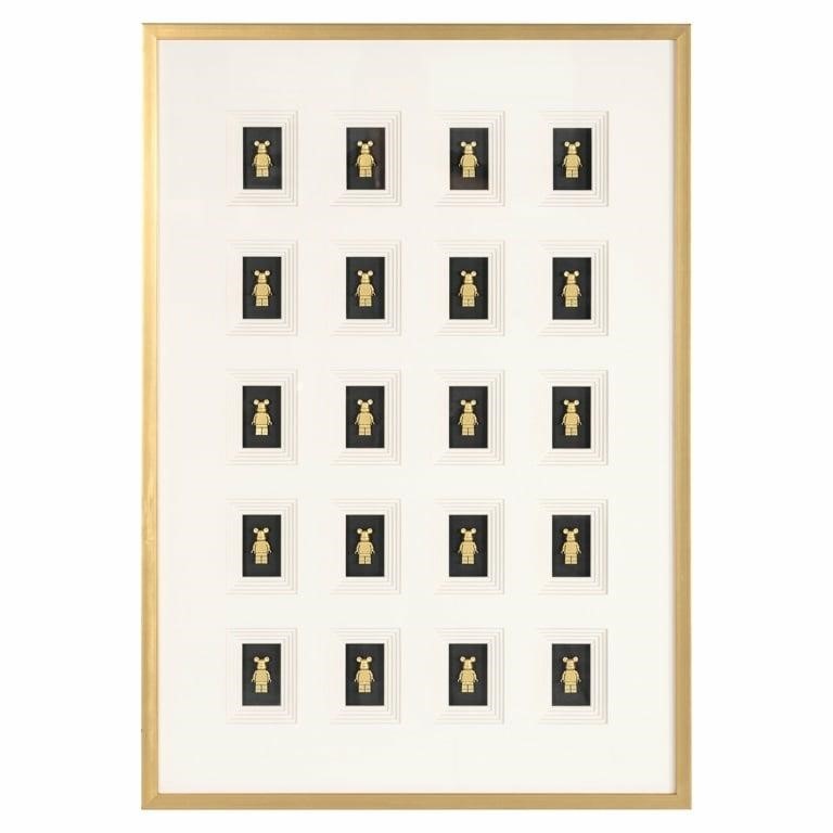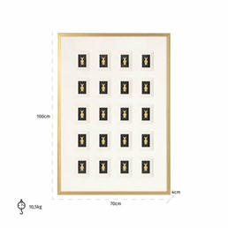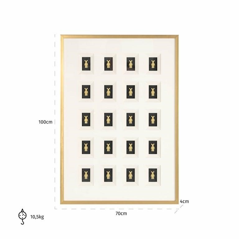 Obraz BEAR BLOCK 3D o wymiarach 100x70 cm to niezwykła dekoracja, która wyróżnia się unikalną kompozycją łączącą różnorodne materiały, takie jak drewno, tworzywo sztuczne, papier, szkło i MDF. Składa się z 18 trójwymiarowych figurek misiów w złotej kolorystyce, które są symetrycznie rozmieszczone na czarnych panelach, kontrastujących z jasnym tłem. Całość zamknięta jest w eleganckiej złotej ramie, co nadaje obrazowi luksusowy charakter. Bear Block 3D to idealna dekoracja do nowoczesnych, minimalistycznych wnętrz, wnosząca oryginalność, humor i elegancję.