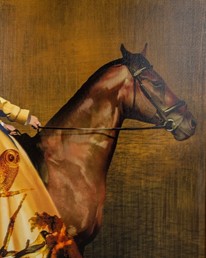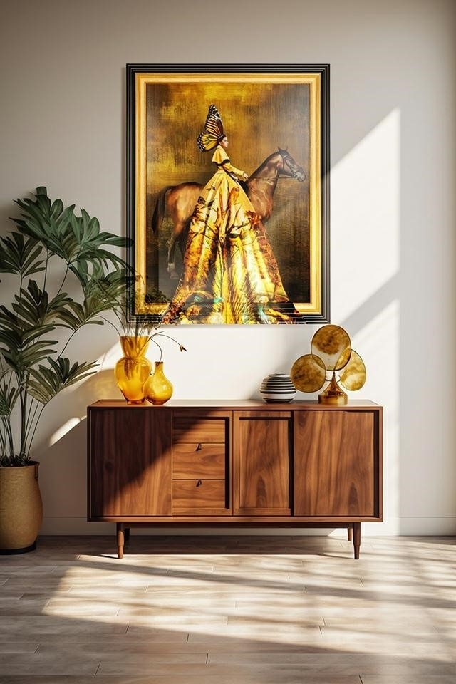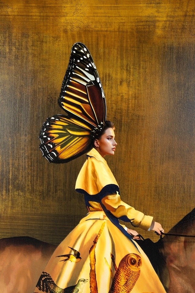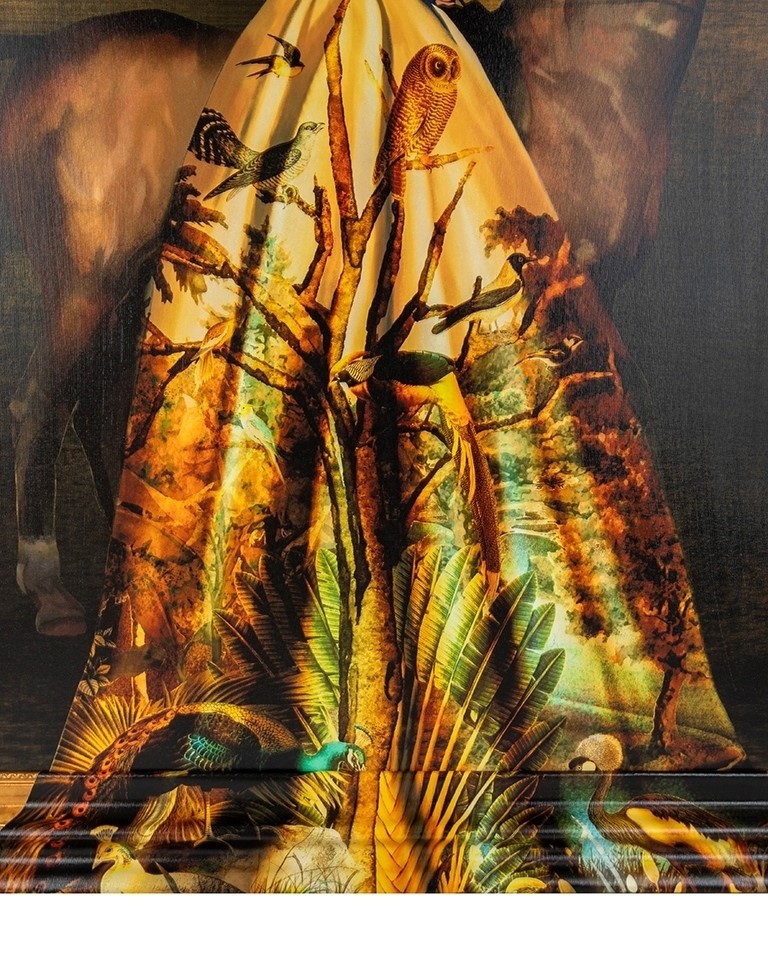 Obraz Dress (110x140 cm) to wyjątkowe połączenie klasyki z nowoczesnym akcentem. Elegancka kobieta ubrana w długą suknię, której dynamiczny wzór tworzy efekt trójwymiarowości, siedzi na koniu, a jej nakrycie głowy przypomina pięknego motyla, nadając całości majestatycznego charakteru. Żywy kolor sukienki wylewającej się na ramę przyciąga wzrok, a cała kompozycja wprowadza do wnętrza dostojność i elegancję. Idealny wybór do salonów, które zyskają na wyrafinowanej atmosferze.