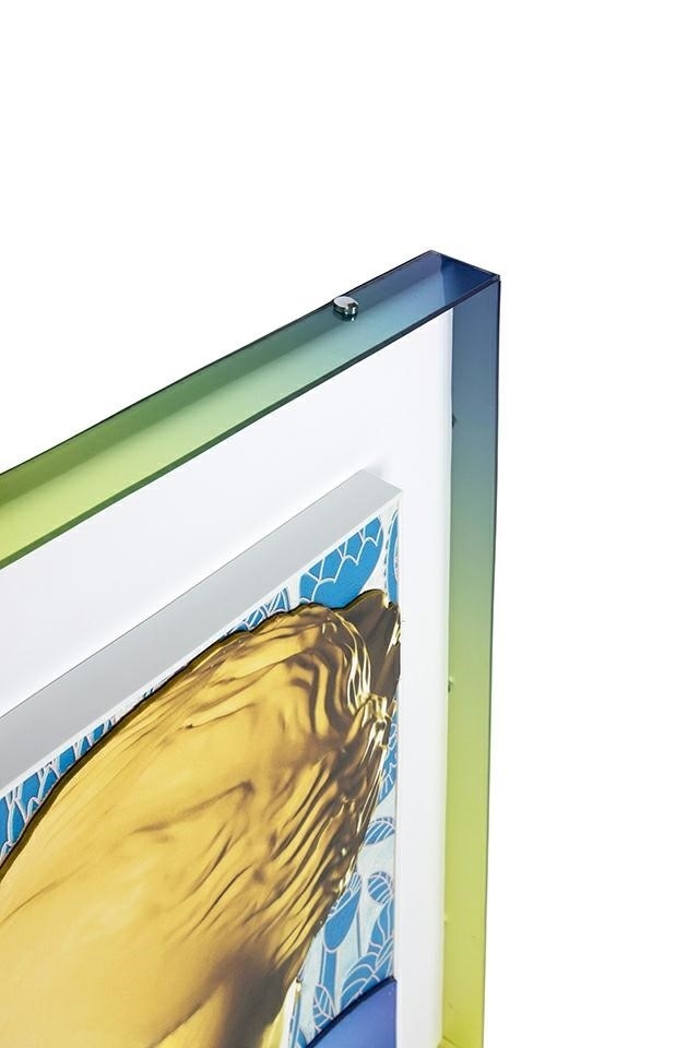 - Żywa niebiesko-żółta kolorystyka w połączeniu z akrylową ramą