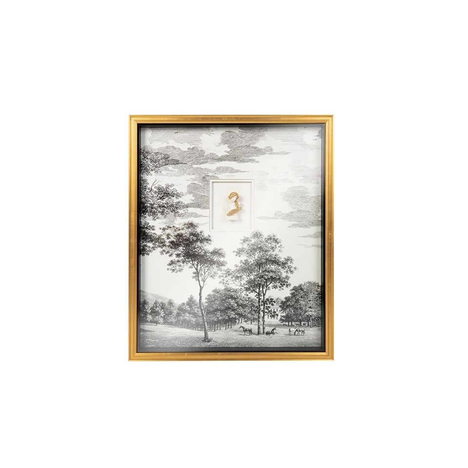 Obraz Head of State 1 (50x60 cm) to nowoczesna grafika, która harmonijnie łączy klasyczne elementy krajobrazu z nowoczesnym akcentem rzeźby kobiety. Złote detale przyciągają wzrok i nadają dziełu wyrafinowanego charakteru, a spokojny motyw natury tworzy atmosferę relaksu. Oprawiona w elegancką złotą ramę, kompozycja doskonale sprawdzi się w nowoczesnych wnętrzach, wnosząc do nich harmonię i subtelną artystyczną nutę.