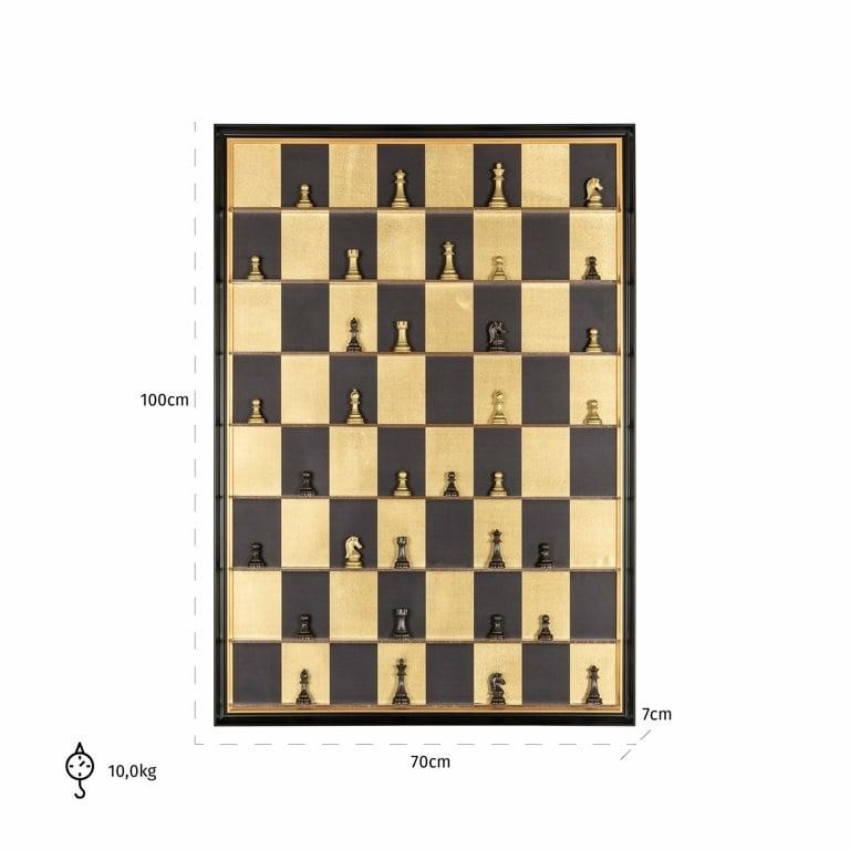 Obraz NALA o wymiarach 100x70 cm to wyjątkowe dzieło sztuki od Richmond Interiors, które wnosi do wnętrza elegancję i wyrafinowanie. Przedstawia nietypową interpretację szachownicy z figurami szachowymi w dynamicznej kompozycji, tworząc wrażenie gry w toku. Złote i czarne kontrasty dodają dziełu luksusowego charakteru. Nala to doskonały wybór dla osób, które cenią zarówno sztukę, jak i intelekt, idealnie komponując się w gabinecie, salonie czy biurze, wypełniając przestrzeń odrobiną luksusu.