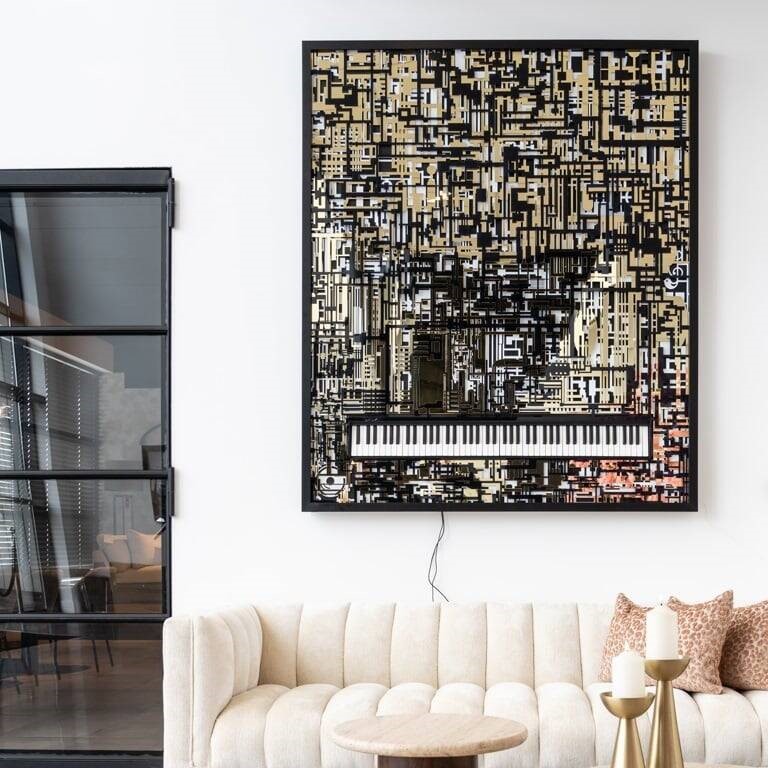 Przedstawiamy wyjątkowy obraz "PIANO WIBI", który łączy nowoczesny, kolorowy design z elegancją klasycznego fortepianu. Ten unikatowy obraz o wymiarach 188x158 cm jest idealnym wyborem dla osób ceniących sztukę i oryginalne dekoracje wnętrz.Współczesne podejście do sztuki wizualnej przejawia się w odważnym połączeniu czerni i złota, co nadaje dziełu głębi i wyrafinowania.