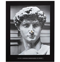 Biało-czarne dzieło sztuki przedstawia zdziwionego młodego mężczyznę, któremu na nosie siadła osa wyróżniona przez artystę kolorem.