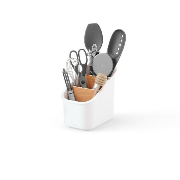 Organizer kuchenny BELLWOOD od Umbra to stylowy i funkcjonalny dodatek do każdej nowoczesnej kuchni. Wykonany z połączenia jasnego drewna i białych akcentów, doskonale łączy w sobie estetykę i praktyczność. Kompaktowa forma i podział na przegródki pozwalają wygodnie przechowywać sztućce, przybory do gotowania, a nawet przyprawy. Wyposażony w ergonomiczny uchwyt, który ułatwia przenoszenie organizera, np. z kuchni na stół podczas serwowania posiłków. BELLWOOD łączy prosty, elegancki design z dużą użytecznością.