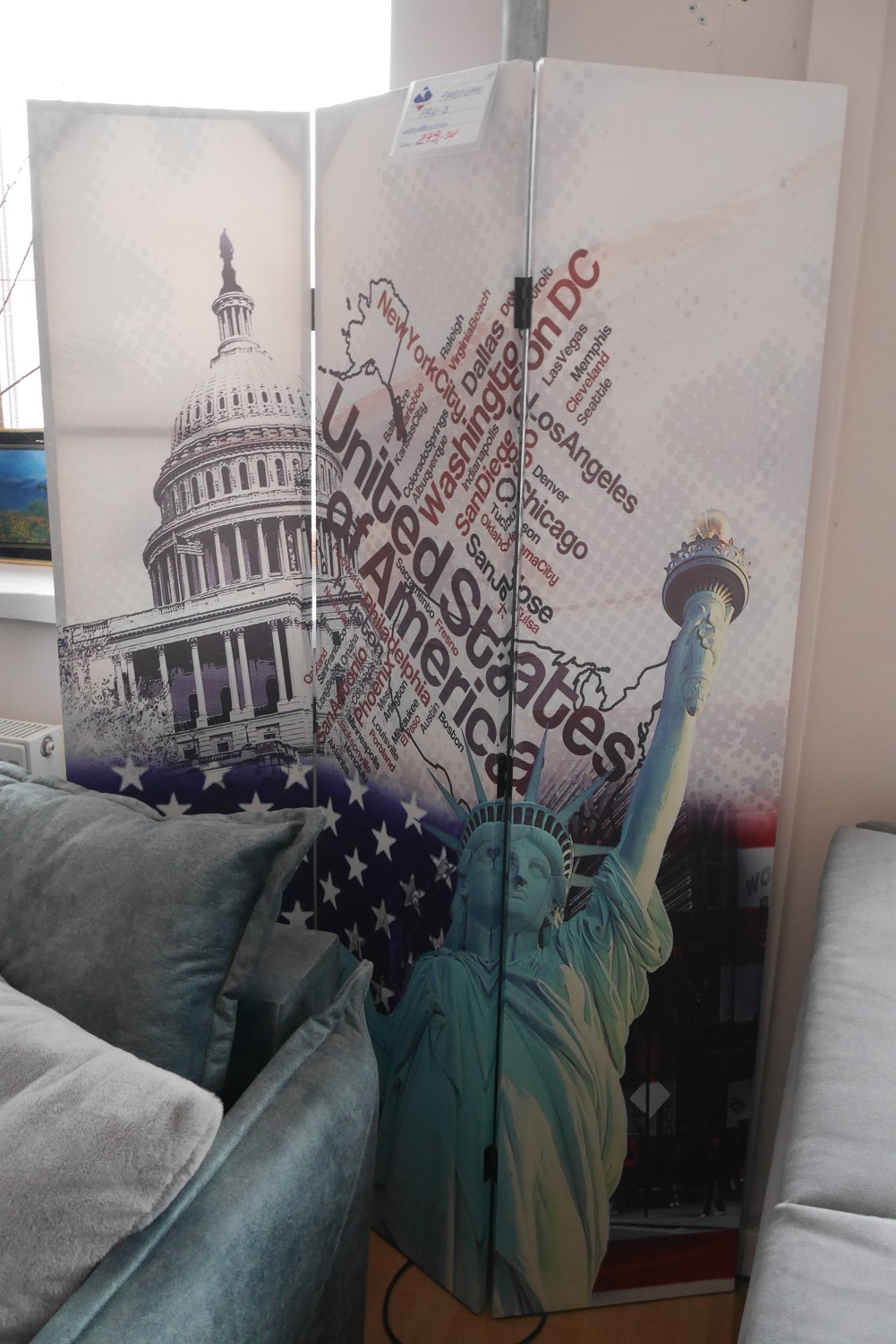 Parawan USA to wyjątkowy dodatek do wnętrz, który łączy funkcjonalność z oryginalnym designem inspirowanym klimatem amerykańskiej stolicy. Parawan składa się z trzech paneli ozdobionych grafikami przedstawiającymi charakterystyczne elementy ameryki, takie jak Biały Dom, Statusa Wolności oraz mapa USA. Idealny do podziału przestrzeni w pomieszczeniu, stworzenia przytulnego kącika lub dodania wnętrzu nowoczesnego i stylowego akcentu.