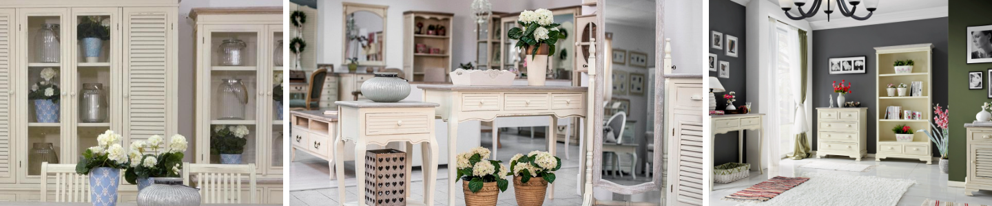 Charakterystyczne, gięte nóżki utrzymane w spójnej kolorystyce dodają meblom majestatu. Delikatność oraz harmonię uzyskano dzięki metalowym uchwytom, pomalowanym tym samym kolorem co całość mebla. Razem z jasnobrązowymi, fazowanymi blatami, a także przetarciami charakterystycznymi dla stylu shabby chic tworzą oryginalny, stylowy mebel z shuttersami, który doda uroku klasycznym wnętrzom.