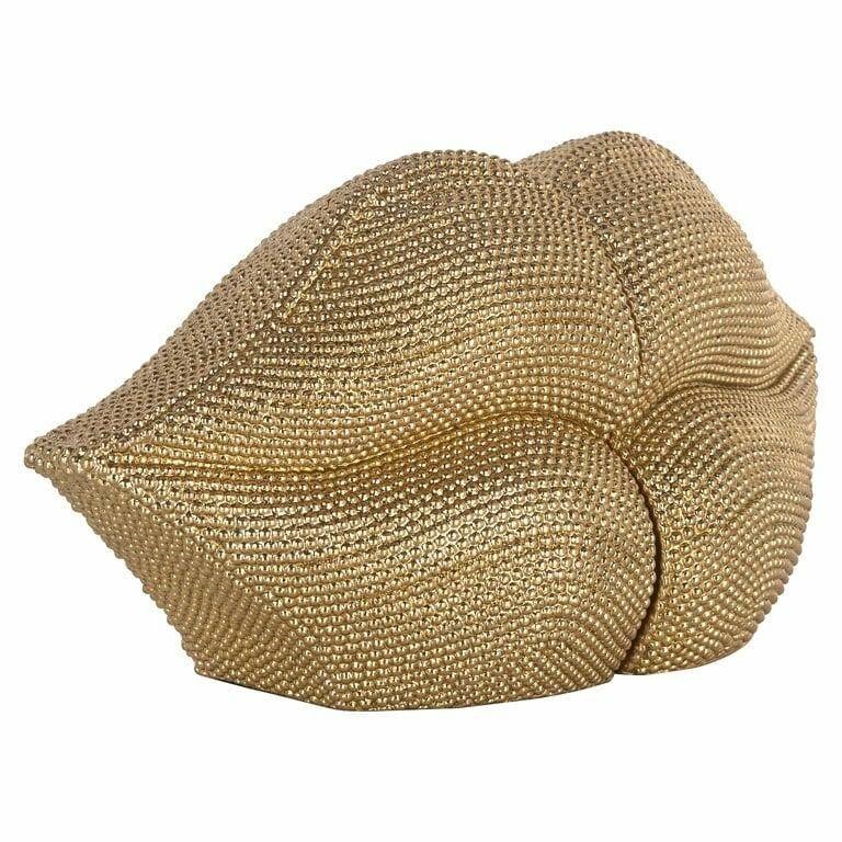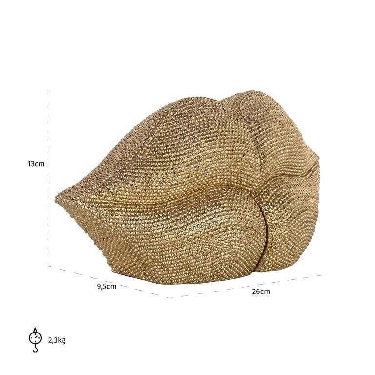 Główną ozdobą są tu biżuteryjnie wykonane usta z żywicy w eleganckiej złotej kolorystyce.