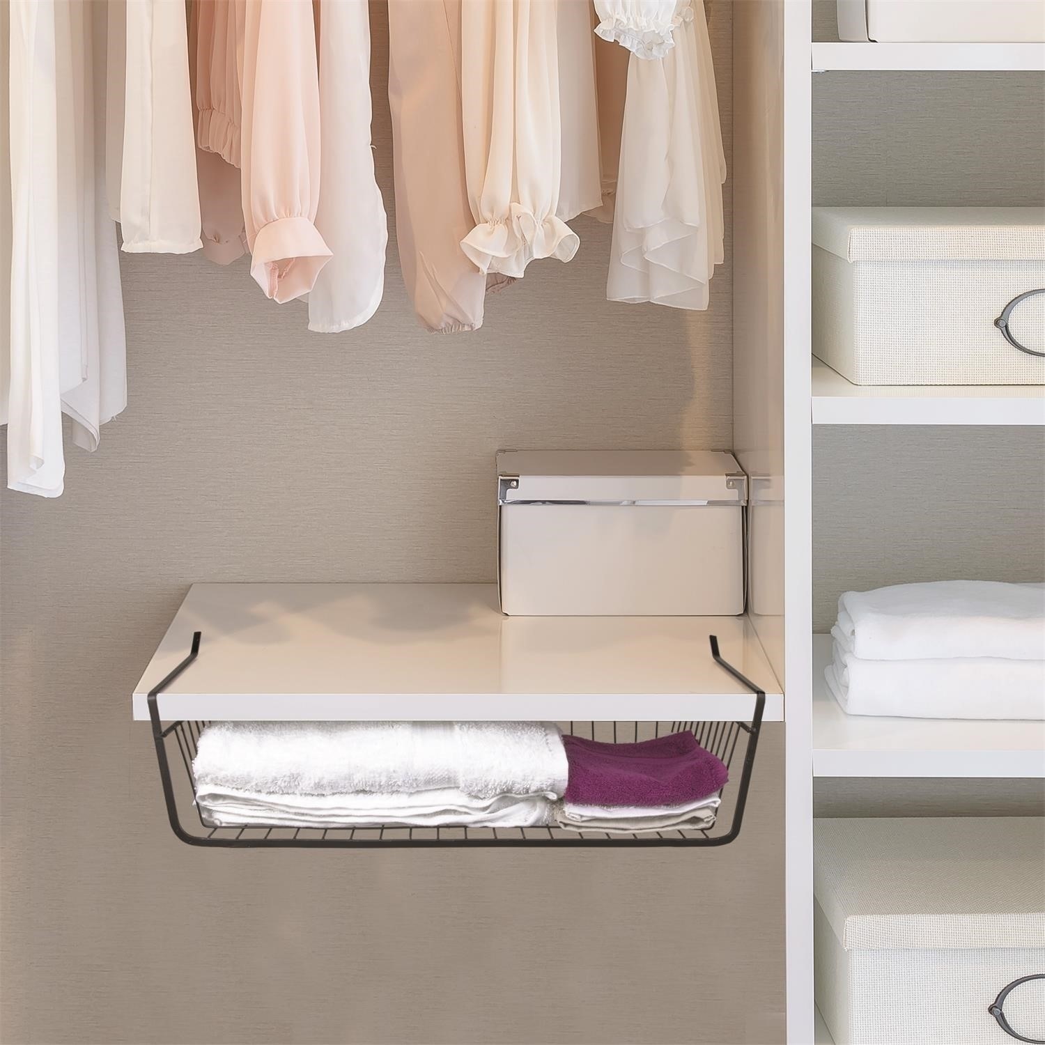 Podwieszany kosz podpółkowy to sprytny sposób na optymalne zagospodarowanie miejsca w kuchennych szafkach lub garderobach. Wystarczy wsunąć go na półkę, aby stworzyć dodatkową przestrzeń do przechowywania drobiazgów lub lekkich akcesoriów. Solidna konstrukcja i uniwersalny czarny kolor sprawiają, że pasuje do każdego wnętrza.