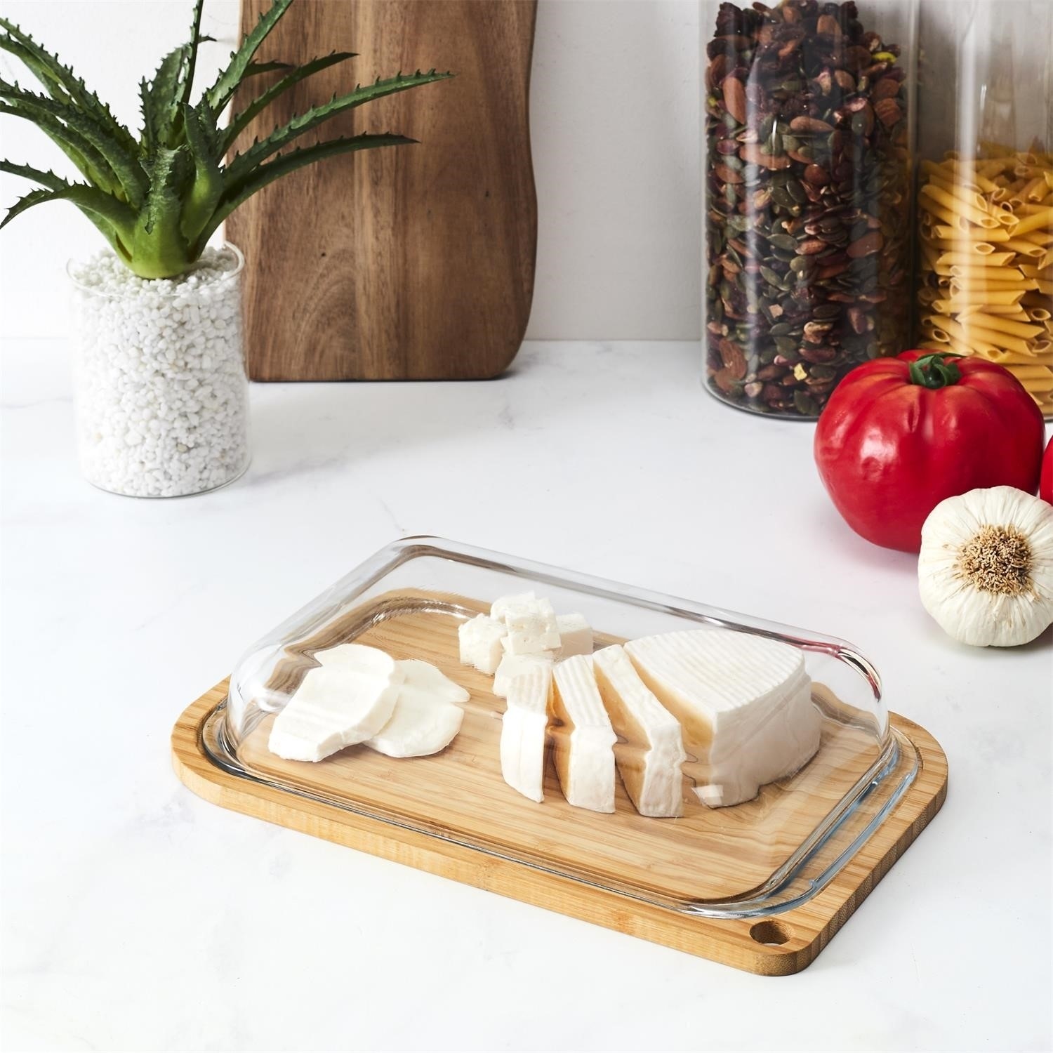 Pojemnik bambusowy 28cm Clear to praktyczne i estetyczne rozwiązanie do przechowywania żywności w Twojej kuchni. Składa się z deski bambusowej o szerokości 28 cm oraz pokrywki ze szkła, co pozwala na zachowanie świeżości produktów takich jak sery, wędliny czy owoce.