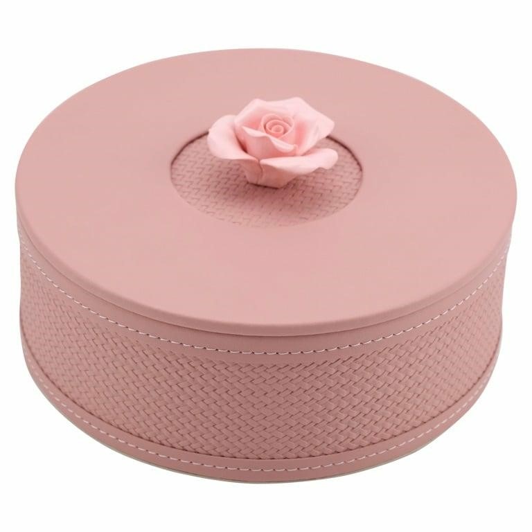 Pojemnik dekoracyjny Mary to uroczy element, który łączy elegancję z funkcjonalnością. Wykonany z wytrzymałego MDF, pokryty poliestrem i PVC, wyróżnia się delikatnym różowym wykończeniem oraz romantycznym uchwytem w kształcie róży. Jego subtelny wzór plecionki wprowadza do wnętrza ciepły, kobiecy akcent, doskonale komponując się w klasycznych aranżacjach. Dzięki dwóm dostępnym rozmiarom, może służyć zarówno jako dekoracja, jak i miejsce przechowywania drobiazgów, łącząc estetykę z praktycznością.