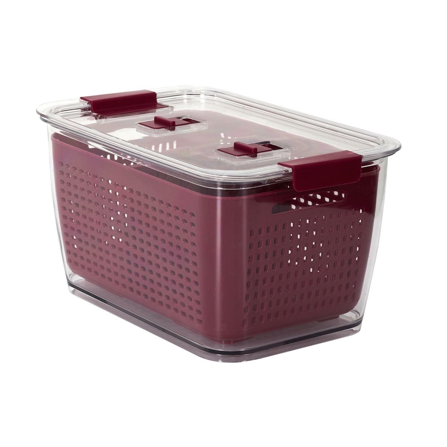 Praktyczny pojemnik do lodówki pozwala na dłuższe przechowywanie świeżych produktów. Dzięki kompaktowemu rozmiarowi łatwo zmieści się na półkach chłodziarki. Bordowy kolor i nowoczesny kształt dodają mu atrakcyjnego wyglądu.