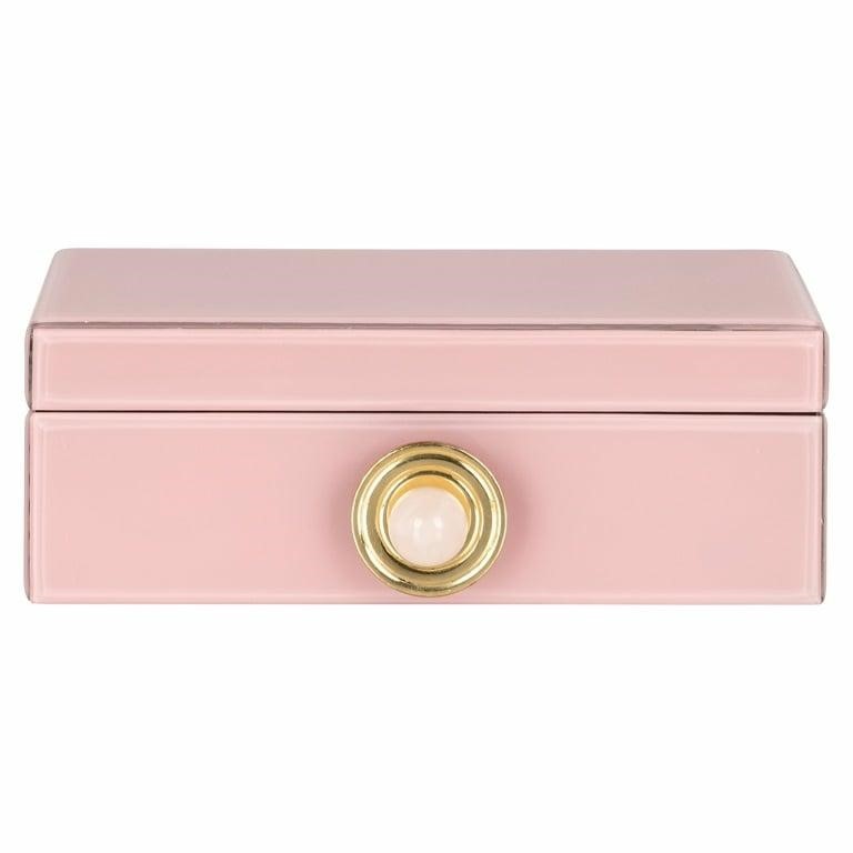 Pojemnik na biżuterię Jamila to kwintesencja stylu i praktyczności. Jego różowe wykończenie wprowadza subtelny akcent do wnętrza, a złoty uchwyt dodaje elegancji i luksusu. Wnętrze wyściełane miękkim zamszem chroni cenne ozdoby, zapewniając jednocześnie wygodne i estetyczne przechowywanie. Jamila to idealny dodatek do każdej toaletki, harmonijnie łączący funkcjonalność z wyrafinowanym designem.
