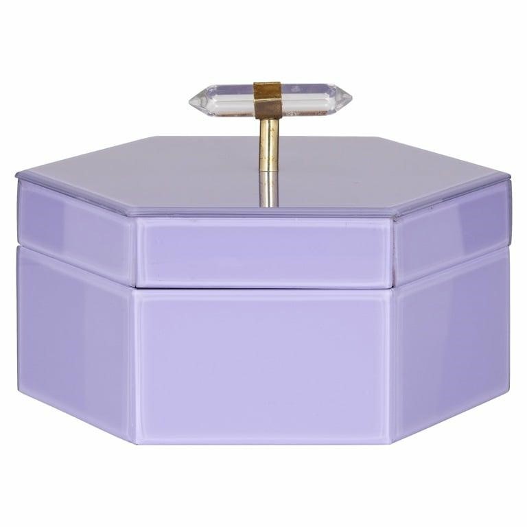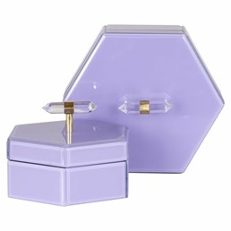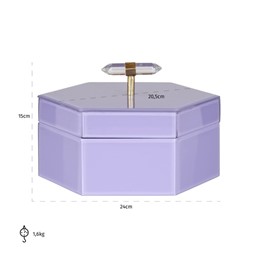 Pojemnik na biżuterię Jutta to połączenie nowoczesnego designu i elegancji. Fioletowy kolor oraz oryginalny sześciokątny kształt czynią go unikalnym dodatkiem do wnętrza. Wyposażony w stylowy uchwyt i wykonany z wysokiej jakości materiałów, takich jak MDF, szkło, żywica i metal, oferuje nie tylko estetykę, ale także funkcjonalność. Dzięki miękkiemu zamszowi w środku biżuteria jest odpowiednio zabezpieczona. Jutta to idealny wybór dla miłośników luksusowych, praktycznych dodatków.