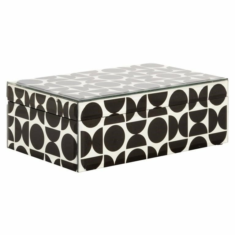Pojemnik na biżuterię Vivian to doskonałe rozwiązanie dla osób ceniących styl i elegancję. Jego wyjątkowy biało-czarny wzór przyciąga uwagę, a transparentne szklane wieko dodaje subtelnego uroku. Wyściełane wnętrze chroni biżuterię, zapewniając jednocześnie jej estetyczne przechowywanie. Vivian to idealny wybór, by przechowywać swoje skarby w wyjątkowym stylu.