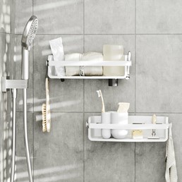 Organizer Adhesive od marki Umbra to praktyczne rozwiązanie do łazienki, łatwe w montażu i odporne na rdzę, idealne do uporządkowania codziennych kosmetyków.