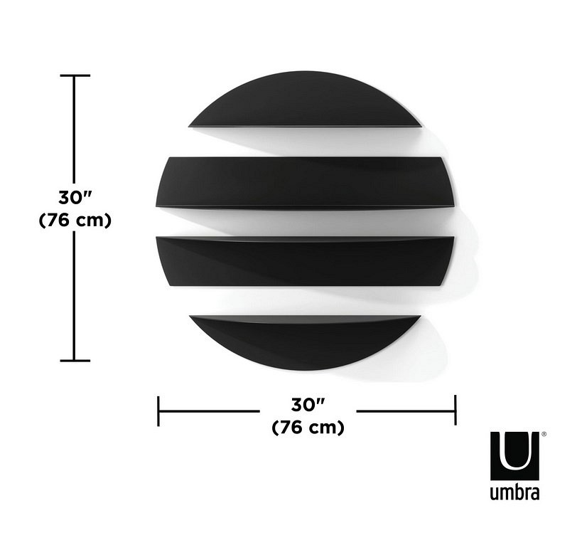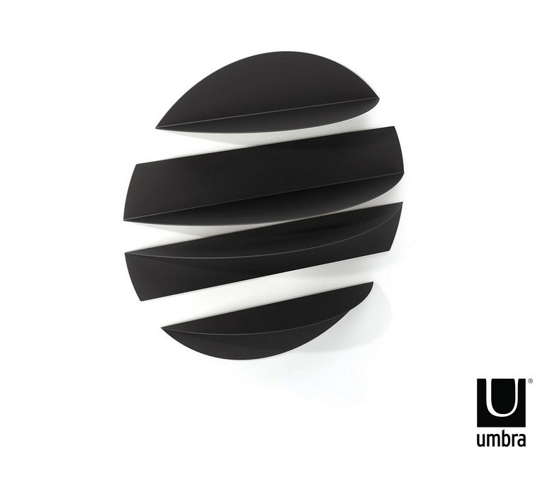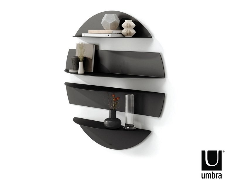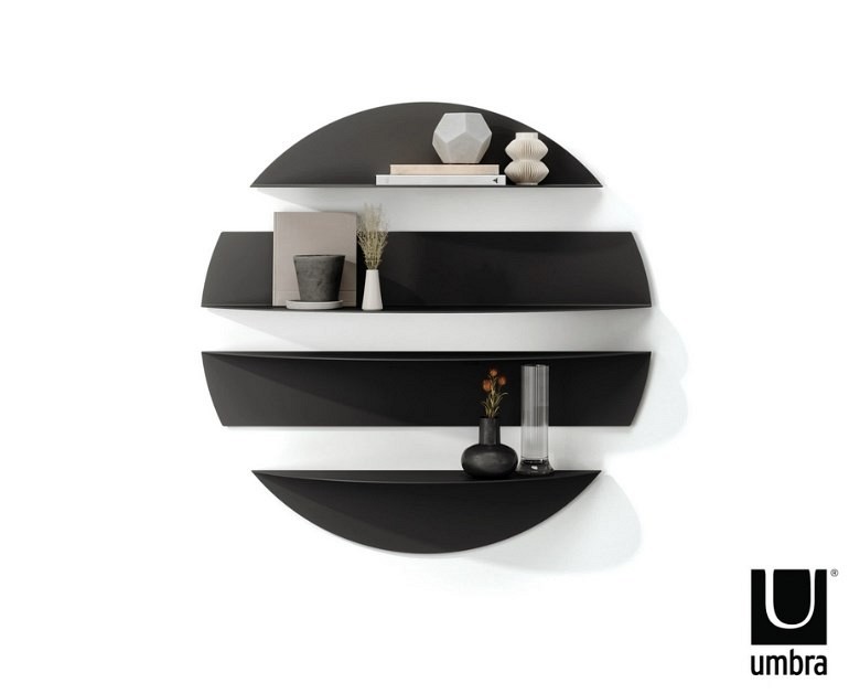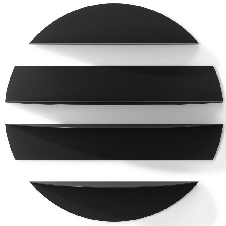 Półka ścienna Ambra Solis. Zestaw czterech unikalnych półek ściennych wykonanych z wypukłego metalu można wykorzystać razem, aby stworzyć przyciągającą wzrok ekspozycję ścienną, która służy również jako miejsce do przechowywania. Składa się z 2 dużych półek i 2 małych półek, a każdą półkę można złożyć osobno lub dowolnie łączyć z półkami skierowanymi do góry lub do dołu. Nośność małej półki wynosi 4,5 kg, a dużej półki 6,8 kg.