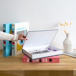 Dekoracyjne pudełko w formie książki inspirowane stylem Bauhaus to połączenie minimalizmu i funkcjonalności. Prosta forma oraz stonowana kolorystyka sprawiają, że doskonale komponuje się z nowoczesnymi i designerskimi wnętrzami. Pudełko pozwala na estetyczne przechowywanie drobnych przedmiotów, jednocześnie stanowiąc spójny element dekoracyjny. To detal, który podkreśla uporządkowaną i przemyślaną aranżację przestrzeni.