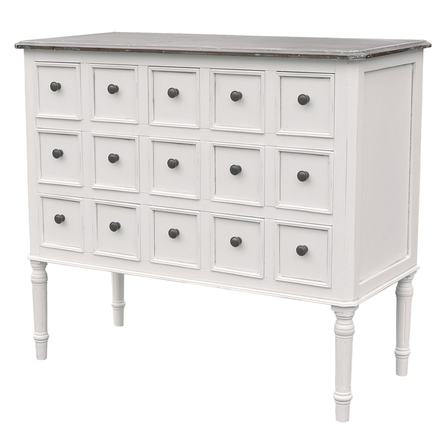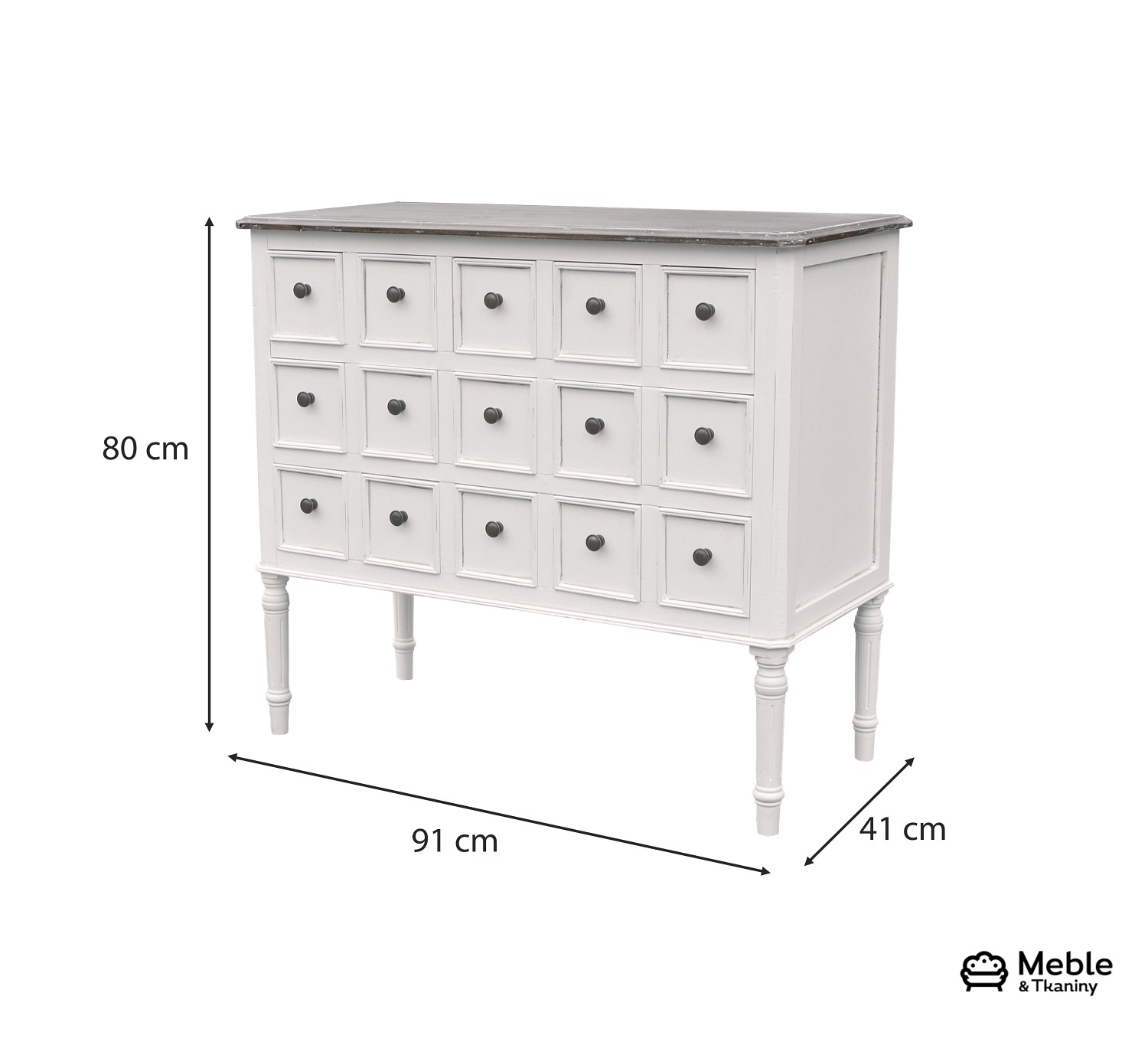 Piętnaście małych szufladek, które pomogą uporządkować Ci nawet najdrobniejsze przedmioty.Toczone, długie nogi dodają komodzie elegancji i są jednocześnie pzeciwwagą dla dużego korpusu. Symetrycznie zamocowane uchwyty wprowadzą harmonię i szyk do Twojego wnętrza.