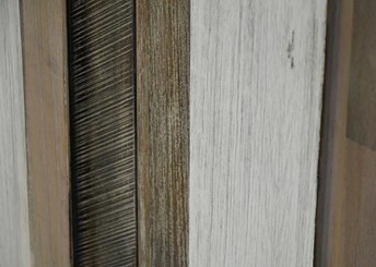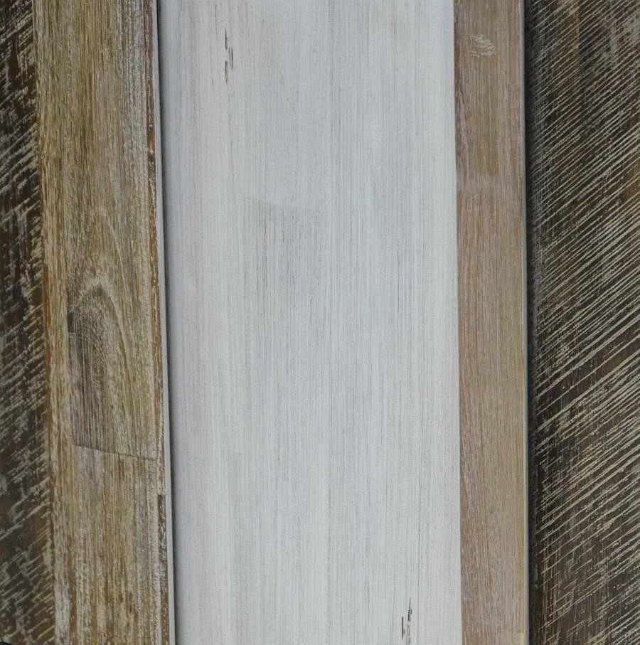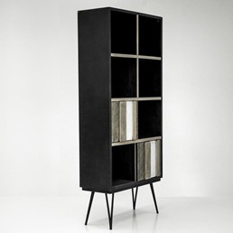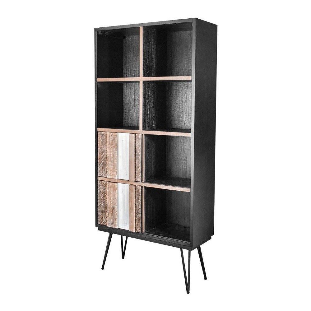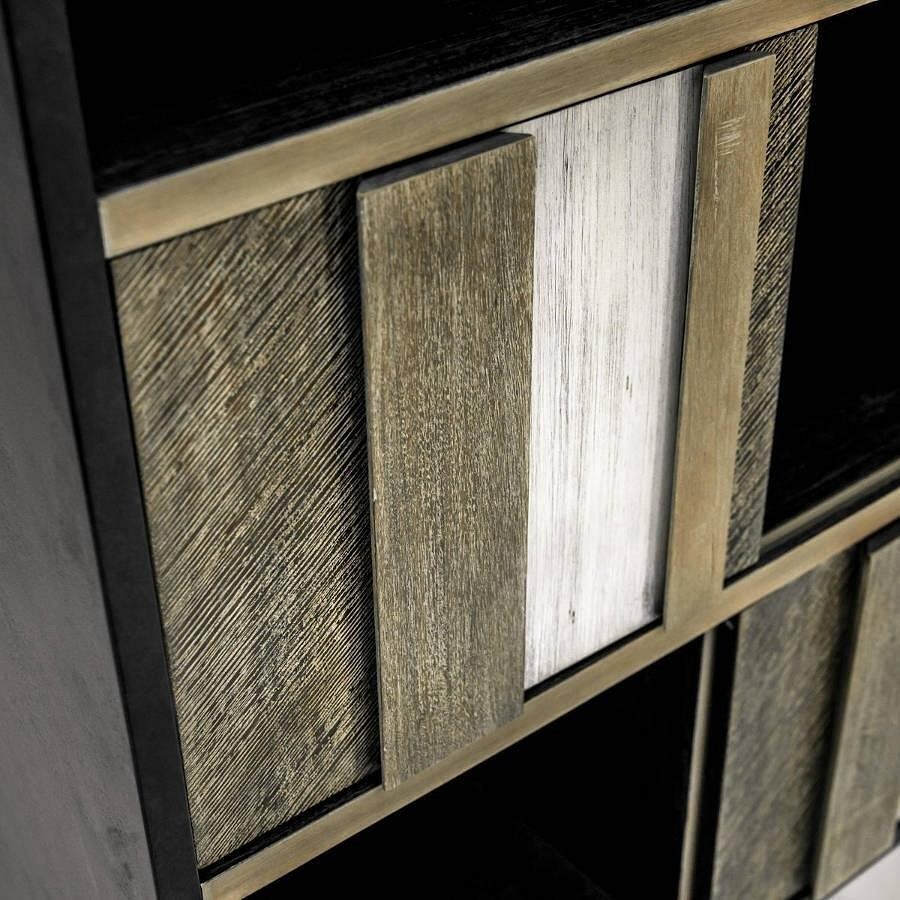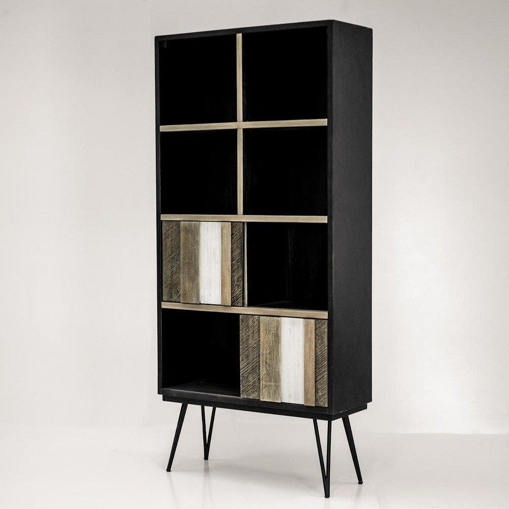 Regał w stylu retro z oryginalnym frontem z litego drewna w różnych odcieniach. Fronty mają fakturę 3D i inną fakturę powierzchni drewna, pełnią również funkcję uchwytu na krawędzi. Szafa z czarnymi metalowymi nogami. Czarny korpus z płyty MDF idealnie komponuje się z szaro-beżowym panelem przednim. Biblioteka posiada przesuwane drzwi i sześć półek.