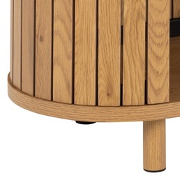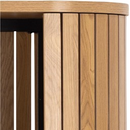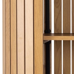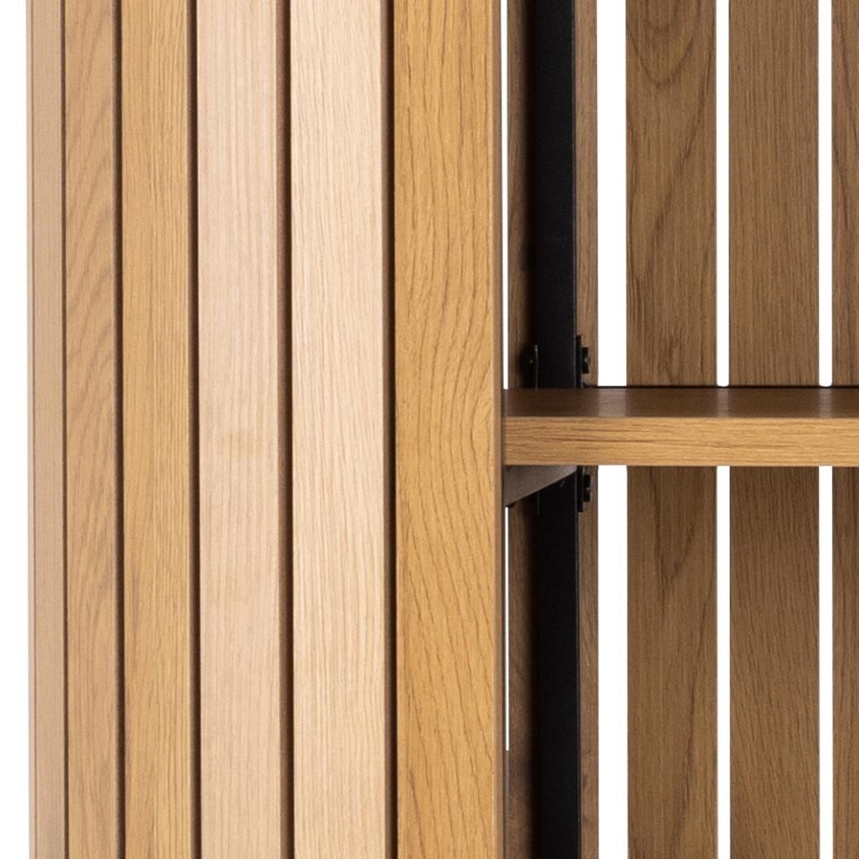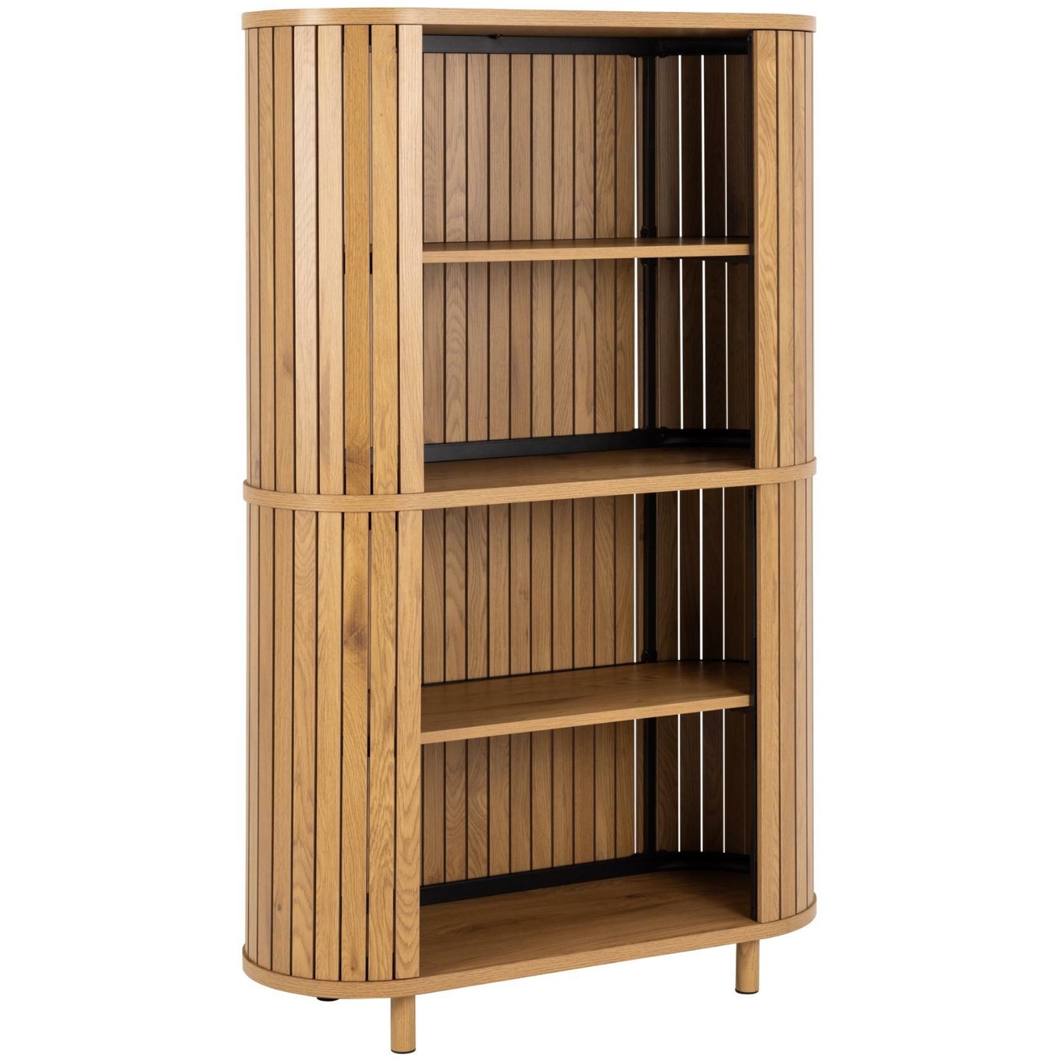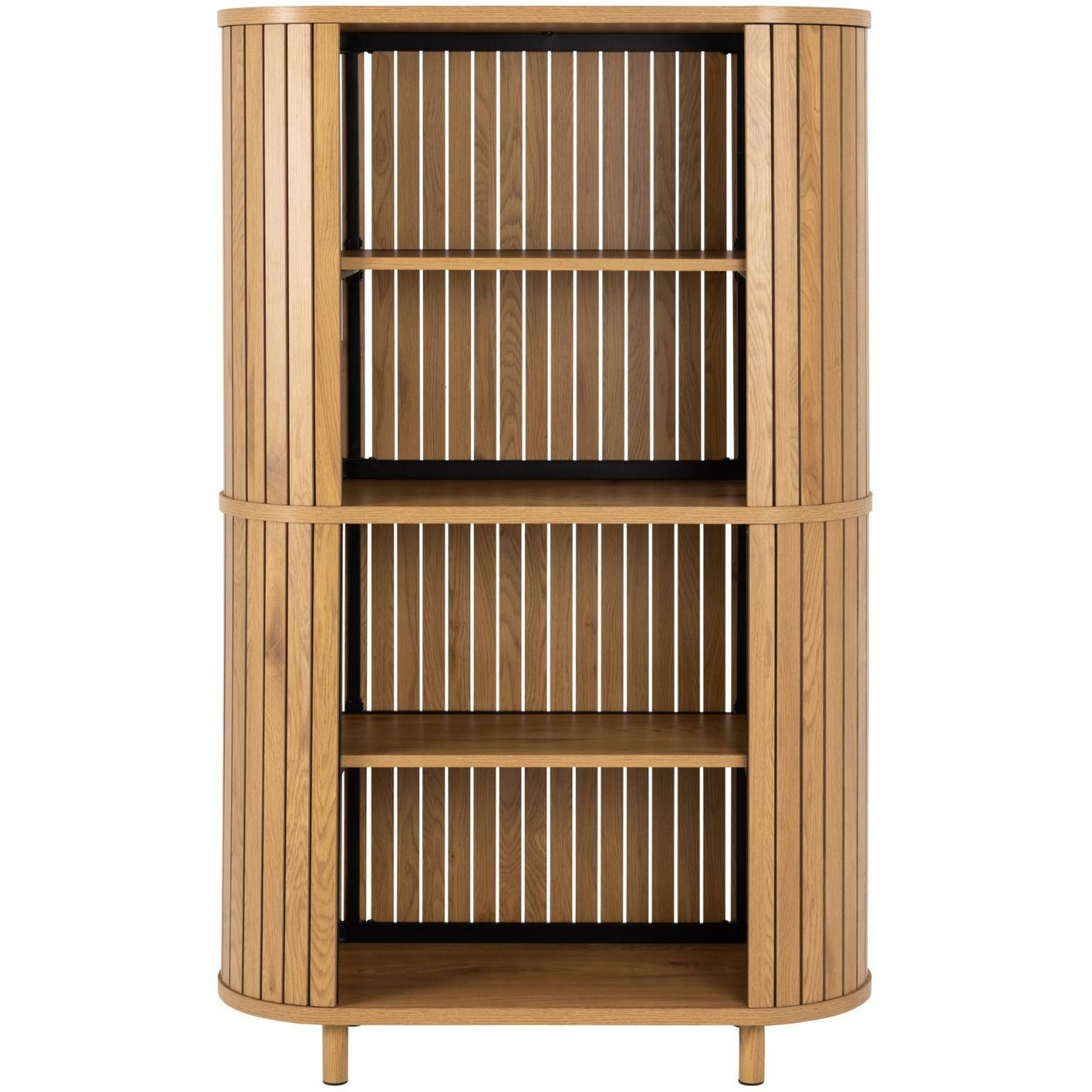 Regał Colima w wykończeniu dzikiego dębu to elegancki i funkcjonalny mebel, idealny do wnętrz w stylu japandi. Wykonany z wytrzymałego MDF, posiada cztery półki pokryte okleiną imitującą matowy dziki dąb, co nadaje wnętrzu naturalny urok i wyjątkowy charakter. Jego rama z lamelami i obły kształt podkreślają harmonię i prostotę, typową dla stylu japandi.