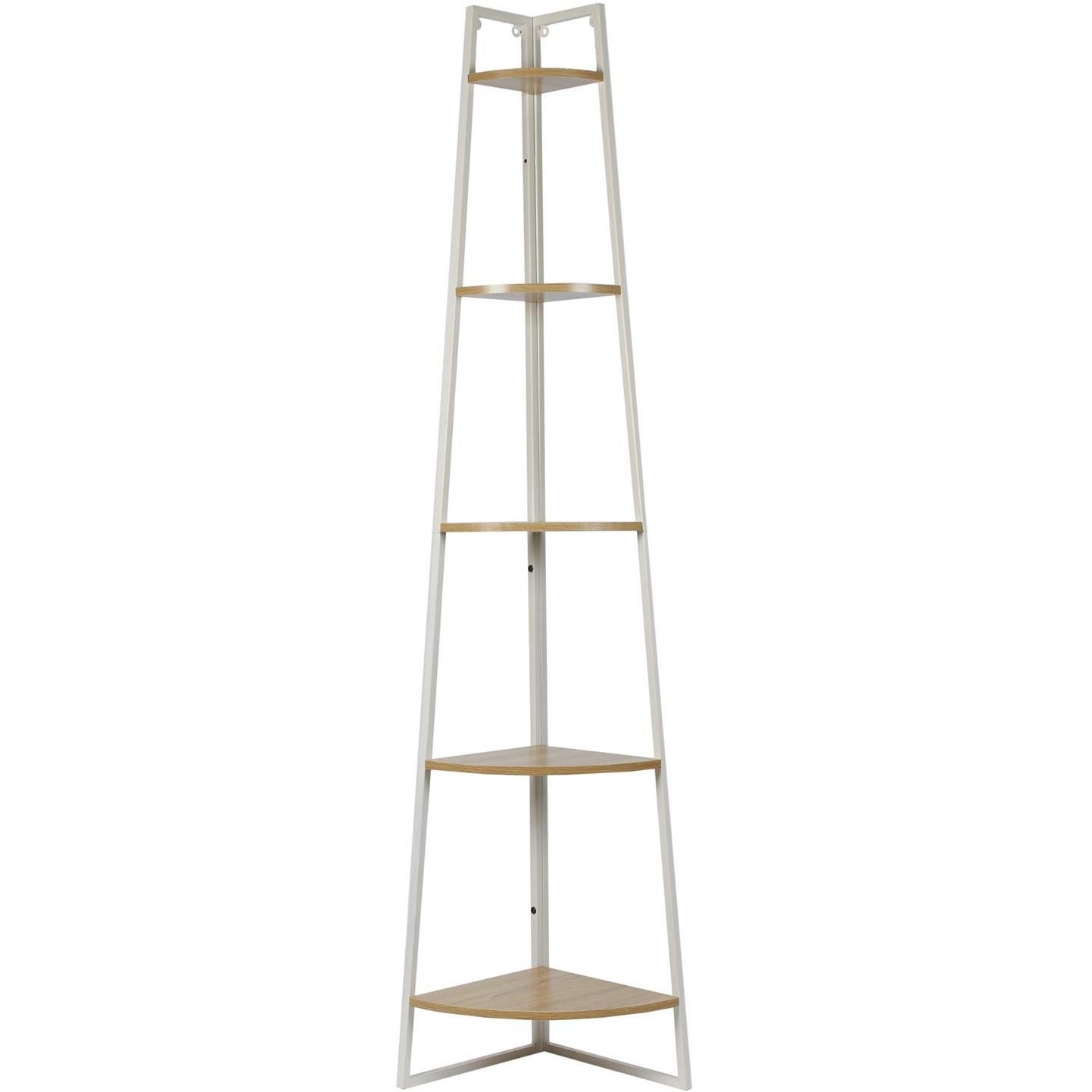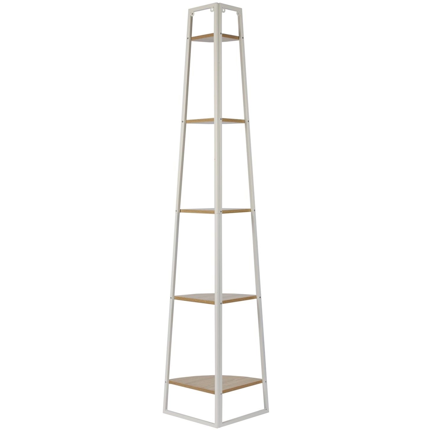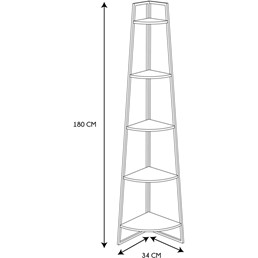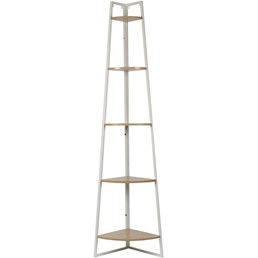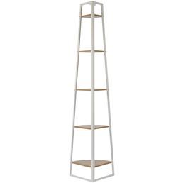 Pięć półek oferuje dużo miejsca na przechowywanie książek, dekoracji czy dokumentów, a metalowa baza pomalowana proszkowo na biało zapewnia stabilność i trwałość. Maksymalne obciążenie każdej półki wynosi 3 kg, co czyni go idealnym do lekkich przedmiotów. Dzięki swojemu nowoczesnemu designowi, regał Corner doskonale wpasuje się w różne style wnętrz, od loftowego po minimalistyczny.