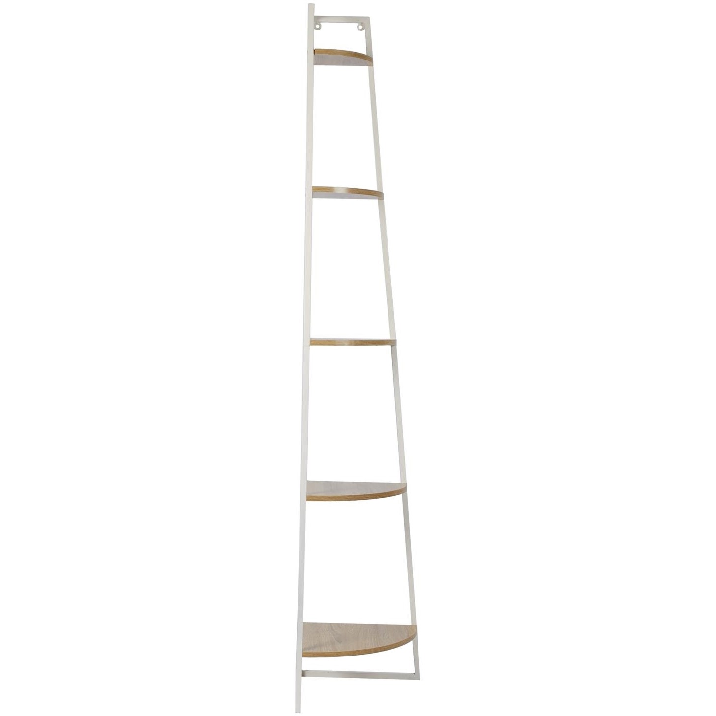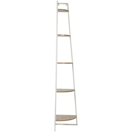 Regał Corner narożny z 5 półkami w kolorze białym to praktyczny i stylowy mebel, idealny do małych przestrzeni. Jego wąska konstrukcja i półki w kształcie ćwierć koła pozwalają na maksymalne wykorzystanie narożników pomieszczeń. Regał wykonany jest z płyty MDF, a jego półki są pokryte laminatem imitującym drewno, co nadaje mu elegancki wygląd.