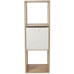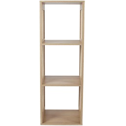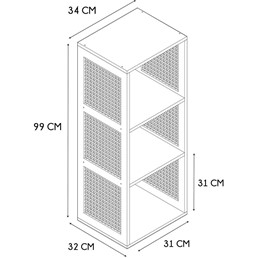 Regał posiada trzy przestronne półki, które oferują mnóstwo miejsca na przechowywanie książek, ozdób czy innych drobiazgów. Dzięki kompaktowym wymiarom (wysokość 99 cm, szerokość 34 cm, głębokość 32 cm), idealnie nadaje się do mniejszych pomieszczeń, nie zajmując przy tym zbyt wiele miejsca.