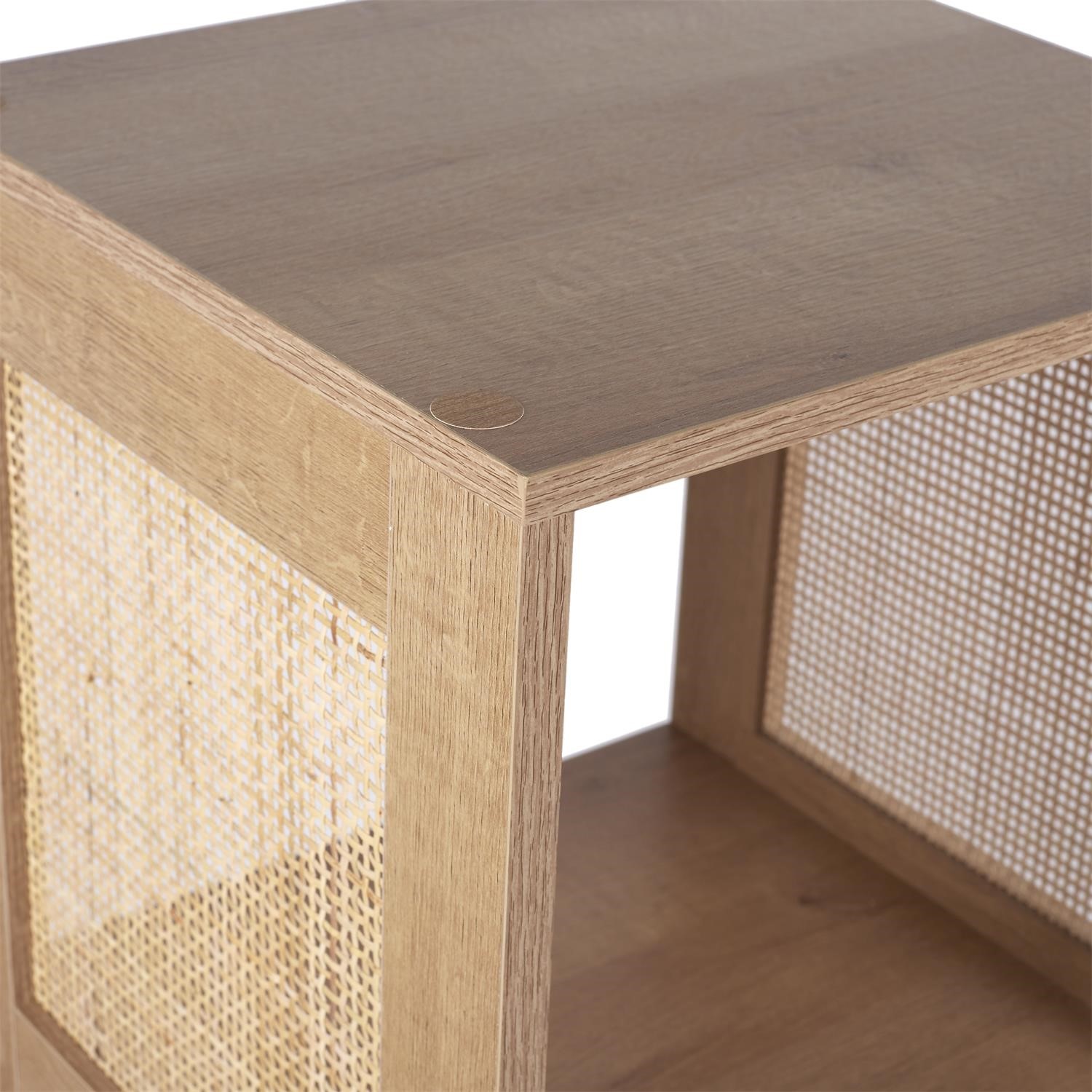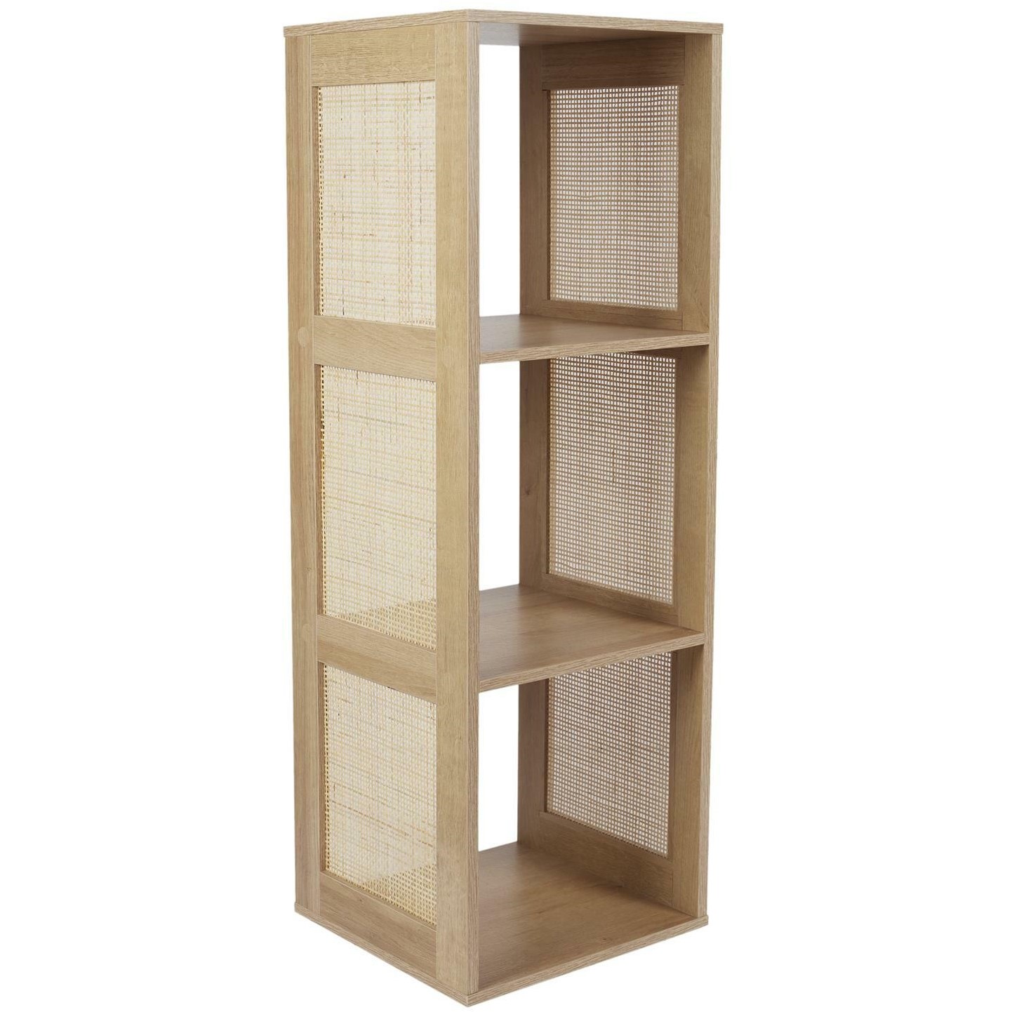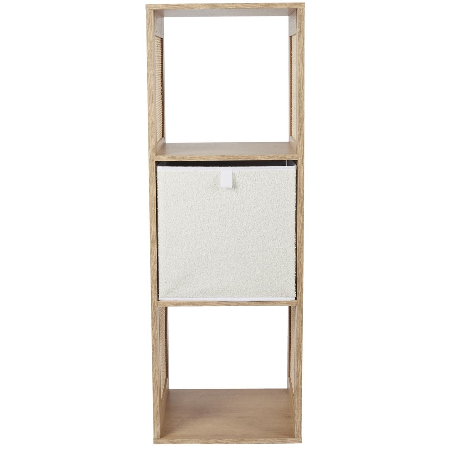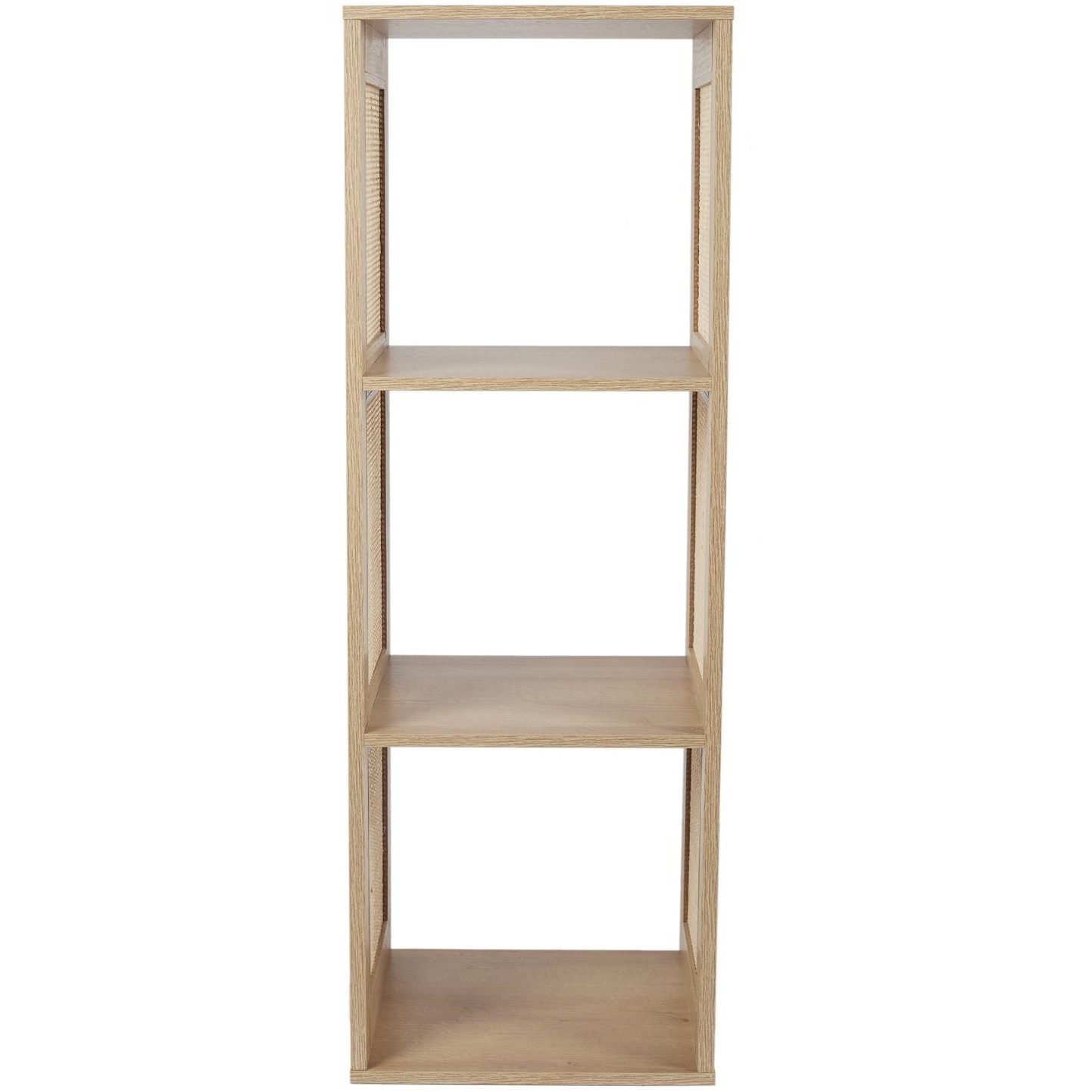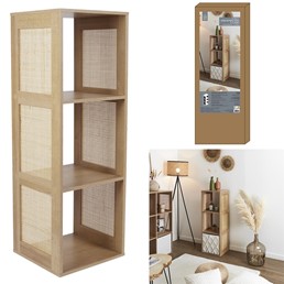Regał Kali 3 półki naturalny to stylowy i funkcjonalny mebel, który doskonale wpasuje się w wnętrza w stylu boho lub skandynawskim. Wykonany z wytrzymałej płyty MDF w okleinie imitującej drewno, zapewnia trwałość i estetyczny wygląd. Jego rattanowe, ozdobne boki dodają naturalnego uroku i lekkości konstrukcji.