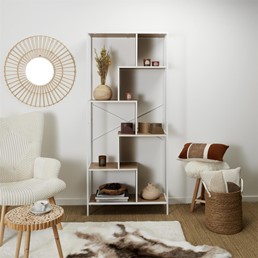 Regał Rack L biały to nowoczesny i funkcjonalny mebel, idealny do wnętrz w stylu loftowym. Wykonany z płyty MDF z okleiną imitującą drewno, prezentuje się elegancko i stylowo. Posiada nieregularne półki, które oferują dużo miejsca na przechowywanie książek, dekoracji czy innych przedmiotów. Jego wymiary to 80 cm szerokości, 30 cm głębokości i 180 cm wysokości, co czyni go kompaktowym, ale pojemnym rozwiązaniem do każdego pomieszczenia.