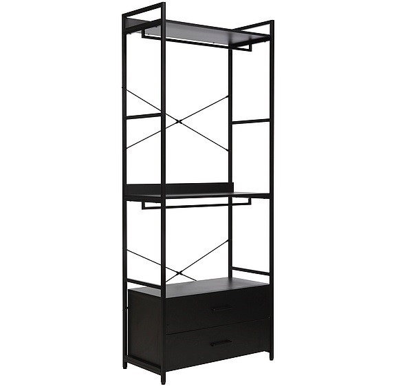 Regał RIN C to metalowa konstrukcja z półkami i szufladami z płyty laminowanej. Prosty metalowy stelaż, 2 drążki na krótką odzież, półki oraz 2 szuflady w dolnej części sprawiają, że jest to nie tylko praktyczne rozwiązanie, ale także element dekoracyjny, który doda charakteru Twojemu wnętrzu.