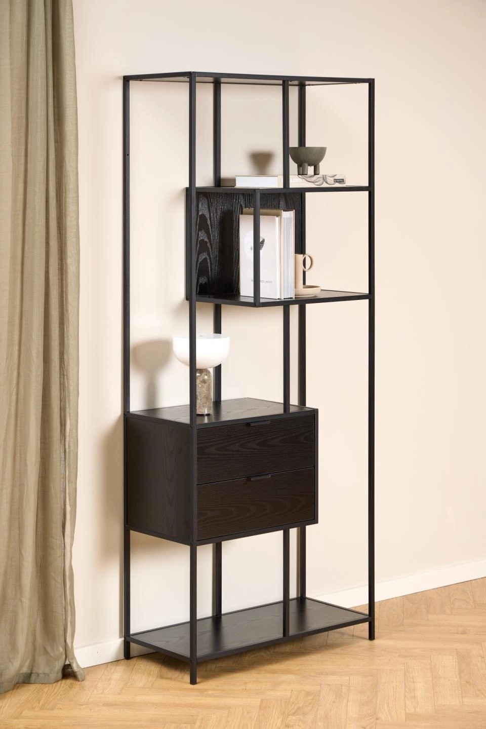 Jego asymetryczna konstrukcja przyciąga wzrok i pozwala na kreatywne aranżacje. Regał posiada sześć półek o różnych rozmiarach, co umożliwia estetyczne eksponowanie książek, roślin, dekoracji i innych przedmiotów. Dzięki otwartej konstrukcji, dostęp do przechowywanych rzeczy jest łatwy i wygodny.