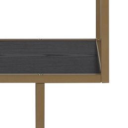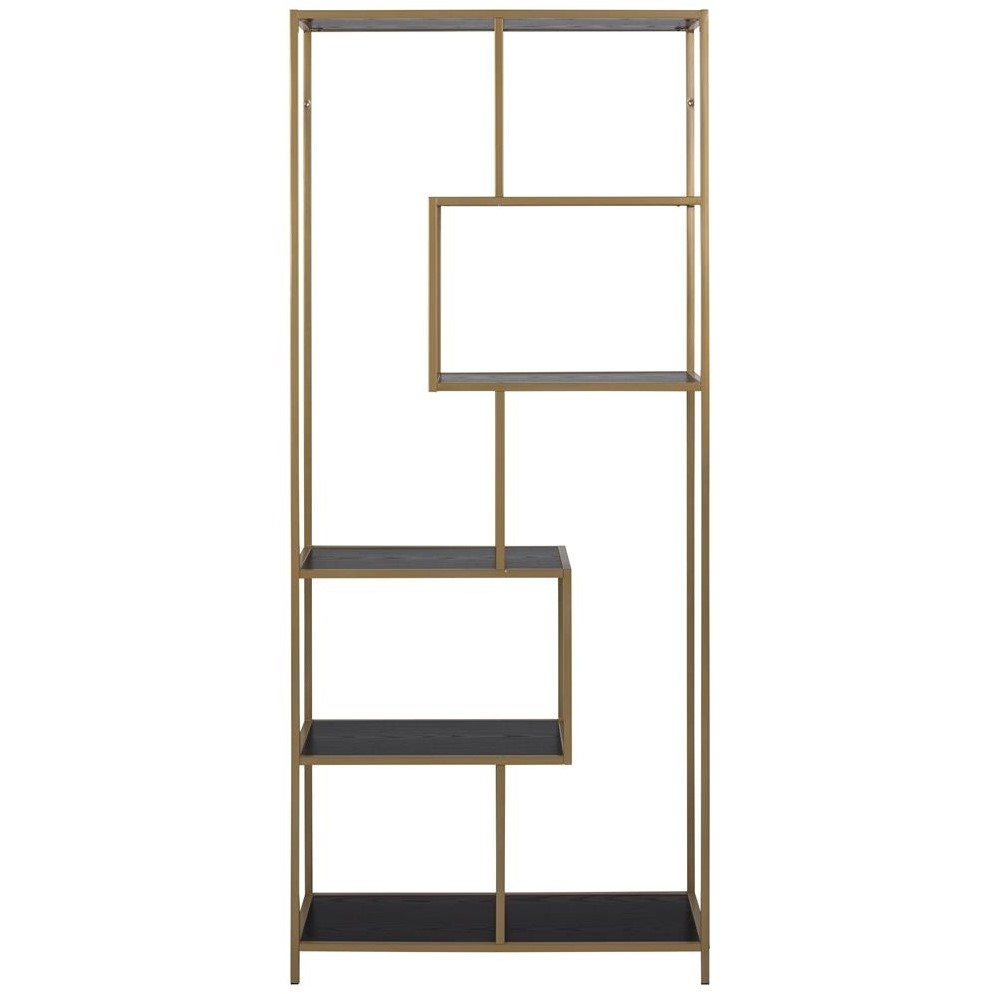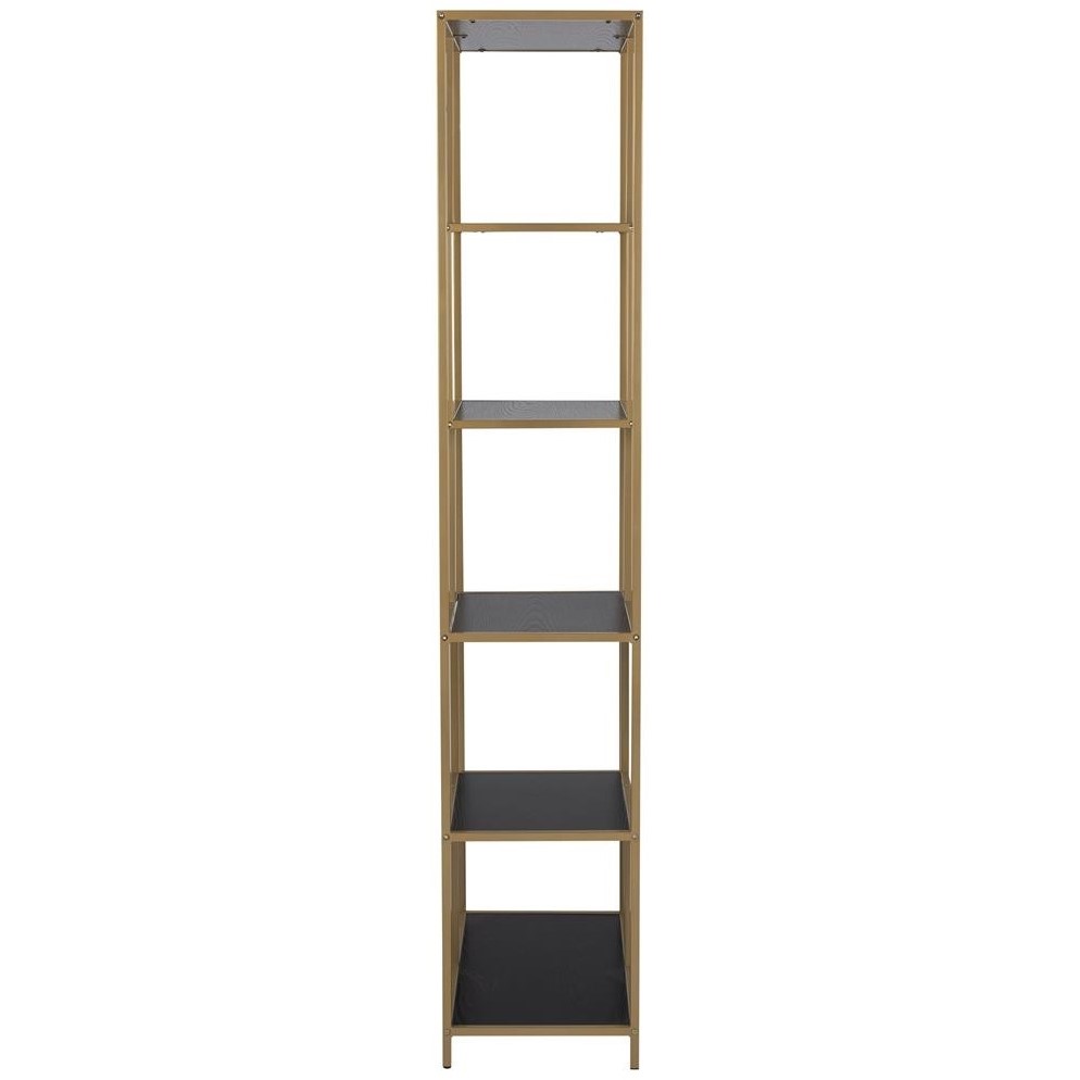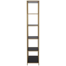 Regał Seaford II złoty/czarny to elegancki i nowoczesny mebel, który doskonale sprawdzi się w różnych wnętrzach. Wykonany z wytrzymałego metalowego szkieletu malowanego proszkowo na złoto, prezentuje się stylowo i solidnie. Półki z płyty MDF w kolorze czarnym imitują drewno, dodając mu naturalnego uroku.