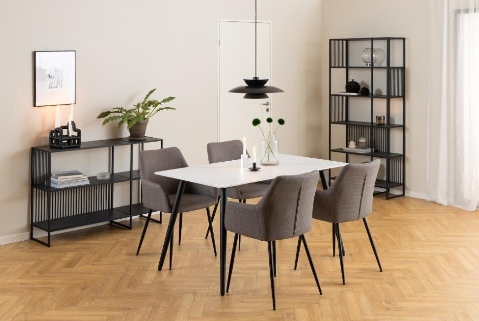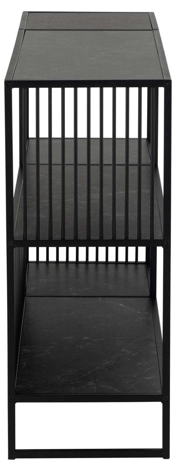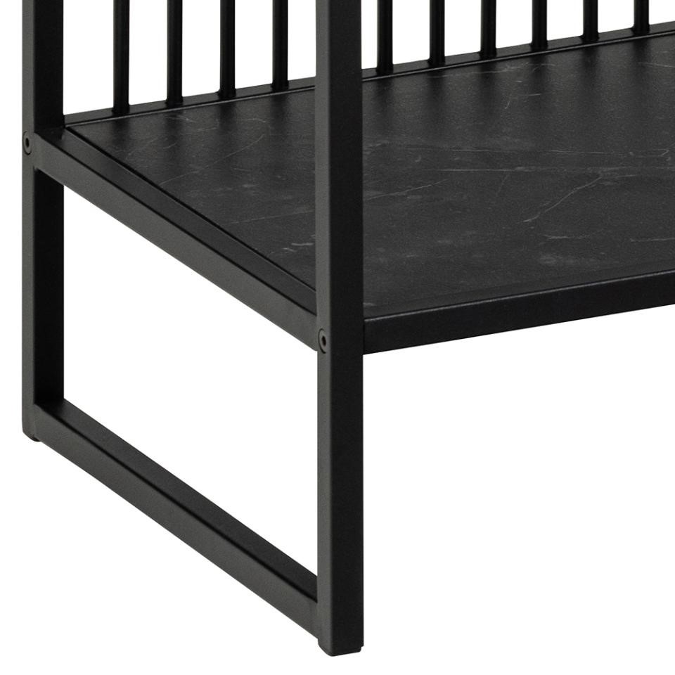 Regał Strington to stylowy dodatek do każdego wnętrza. Jego solidna stalowa rama malowana proszkowo w połączeniu z dwiema półkami ozdobionymi efektem marmuru tworzą harmonijne i nowoczesne rozwiązanie. Pionowe druty w ramie nadają mu charakterystyczny wygląd, a przestronne półki oferują miejsce na dekoracje i pamiątki.