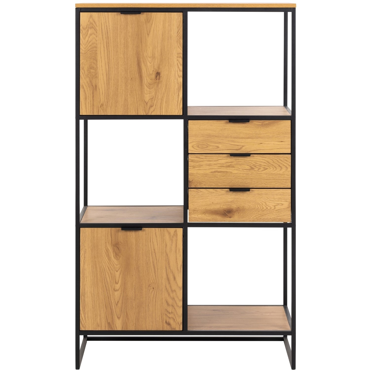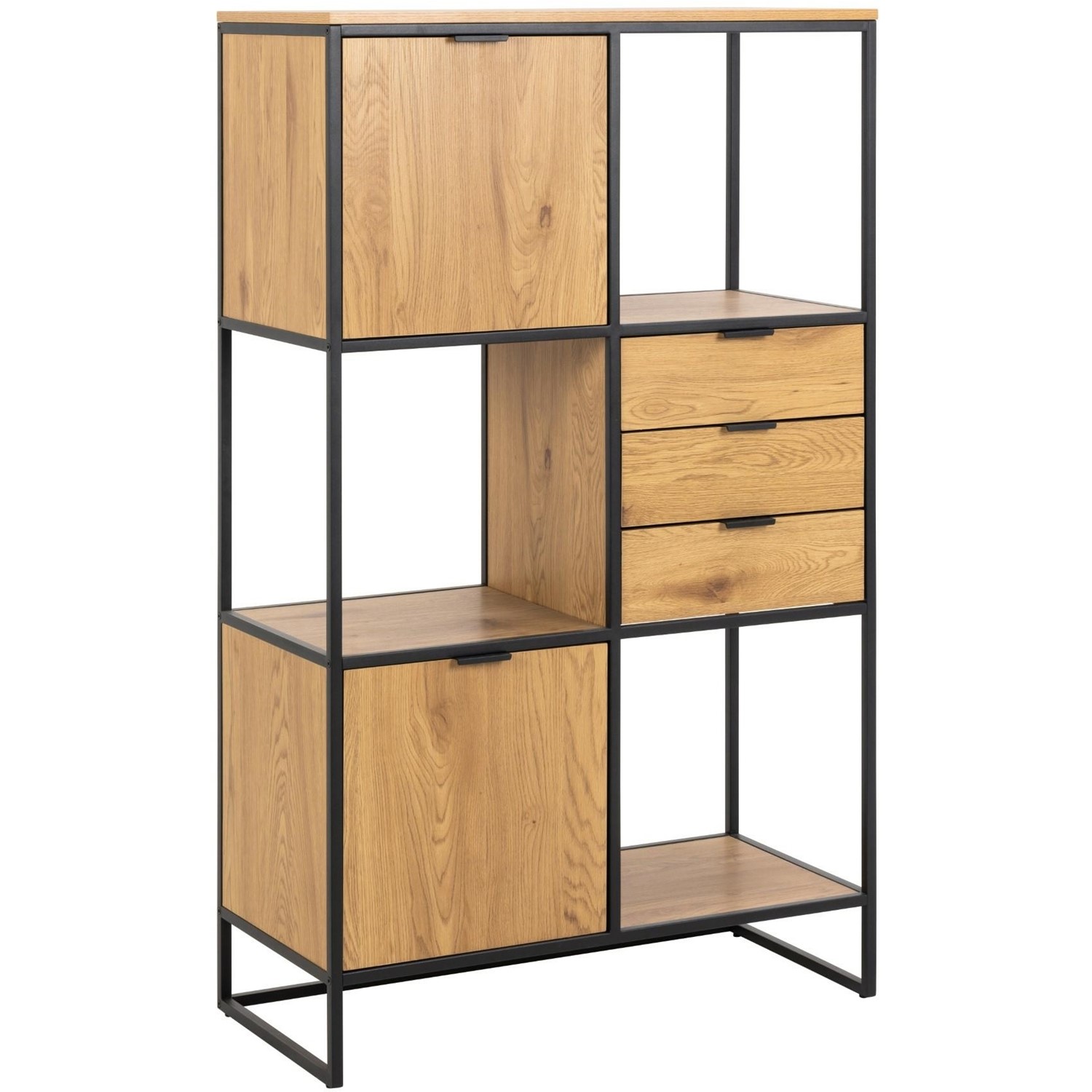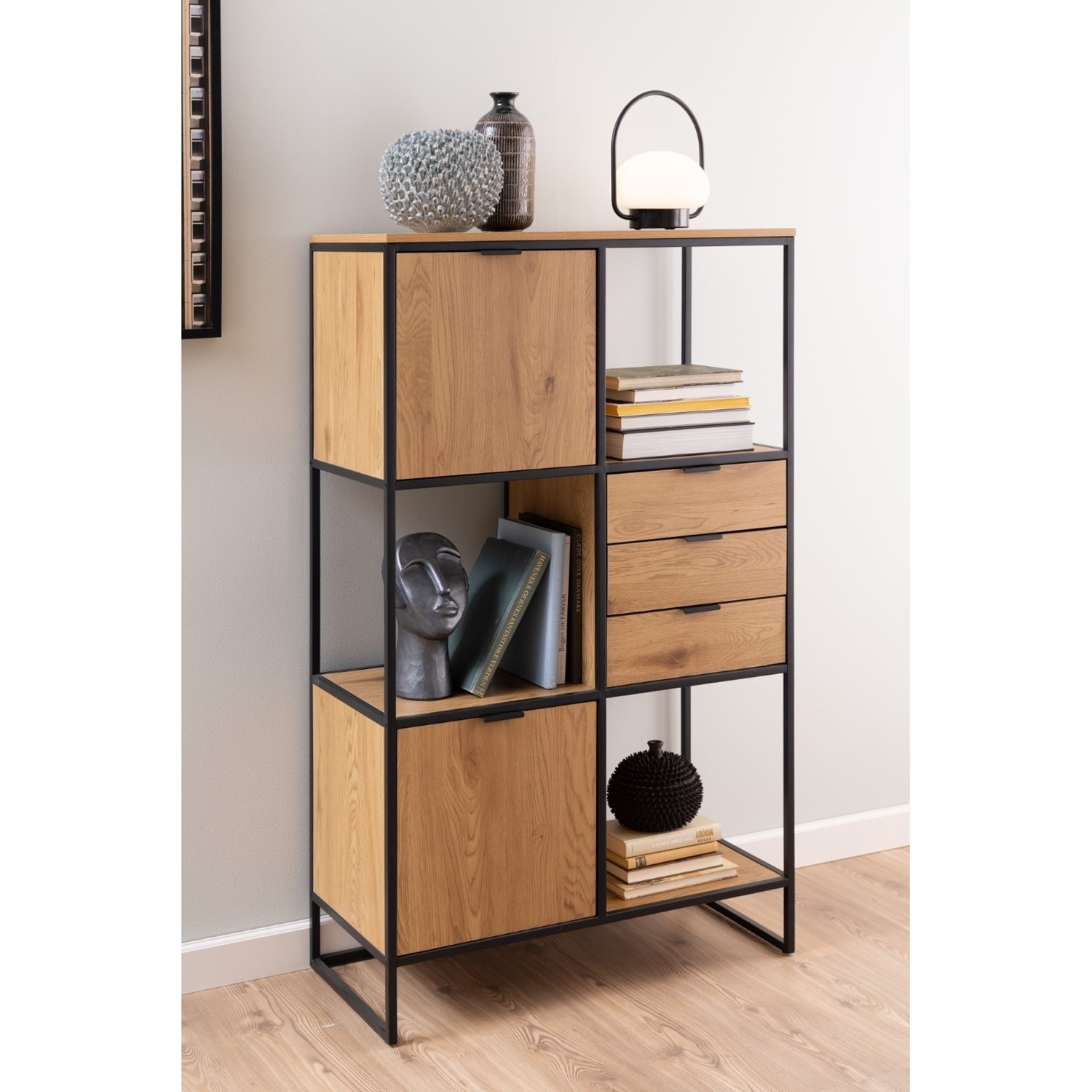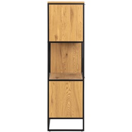 Regał Swindon dąb to wszechstronny mebel idealny do biura, salonu, sypialni lub przedpokoju. Jego estetyczny i przyjazny dla oka design doskonale wpasuje się w nowoczesne i industrialne wnętrza. Regał posiada solidny szkielet z malowanego proszkowo metalu oraz elementy z laminowanej płyty MDF w kolorze drewna. Wyposażony jest w dwie szafki, trzy szuflady i trzy półki, co zapewnia dużo miejsca do przechowywania książek, obrusów i innych codziennych przedmiotów. Odkryte półki są idealne do eksponowania ulubionych pamiątek i roślin. Dzięki odpowiednio ustawionym nogom, łatwo utrzymać czystość pod meblem. Regał Swindon łączy w sobie funkcjonalność i elegancję, stając się piękną ozdobą każdego pomieszczenia.