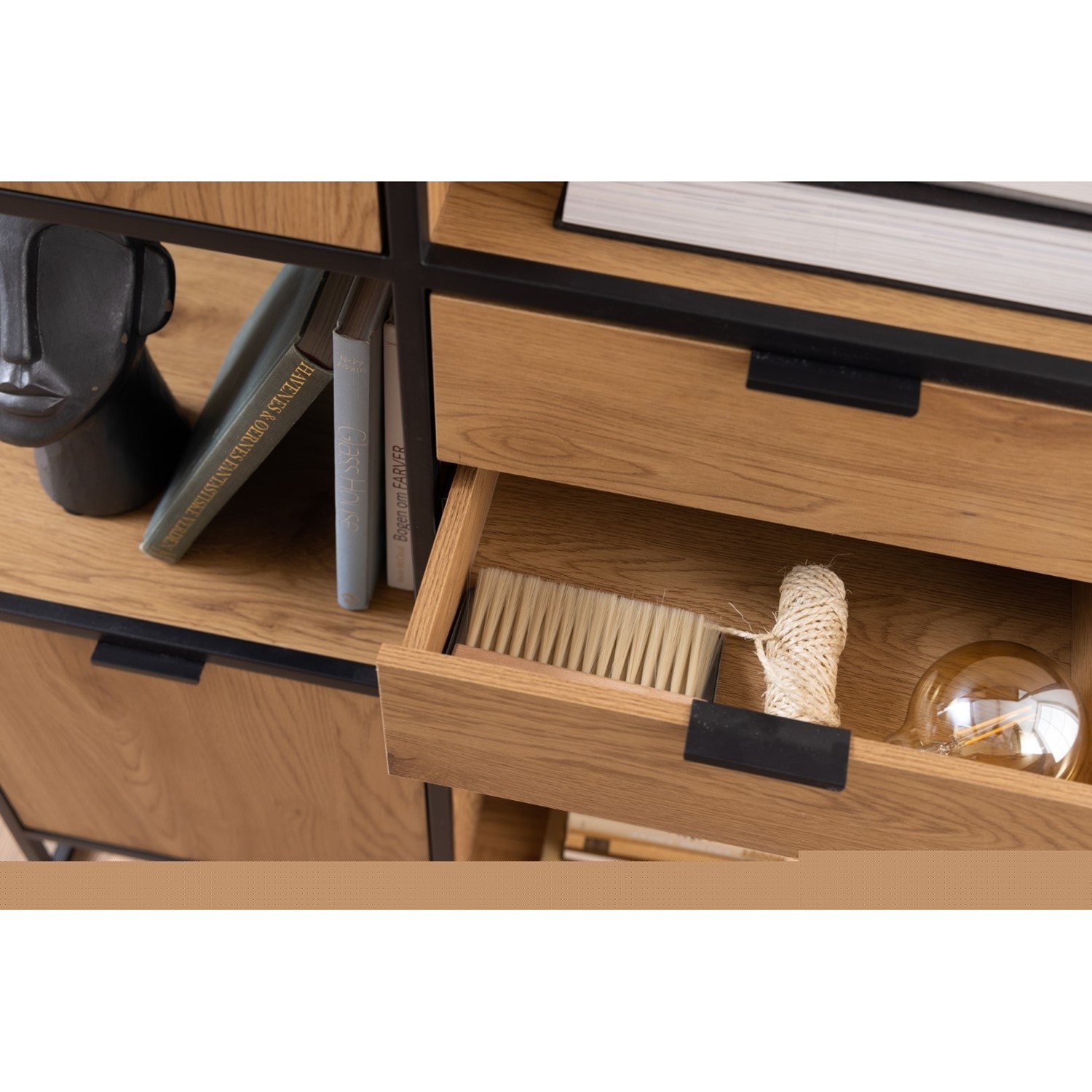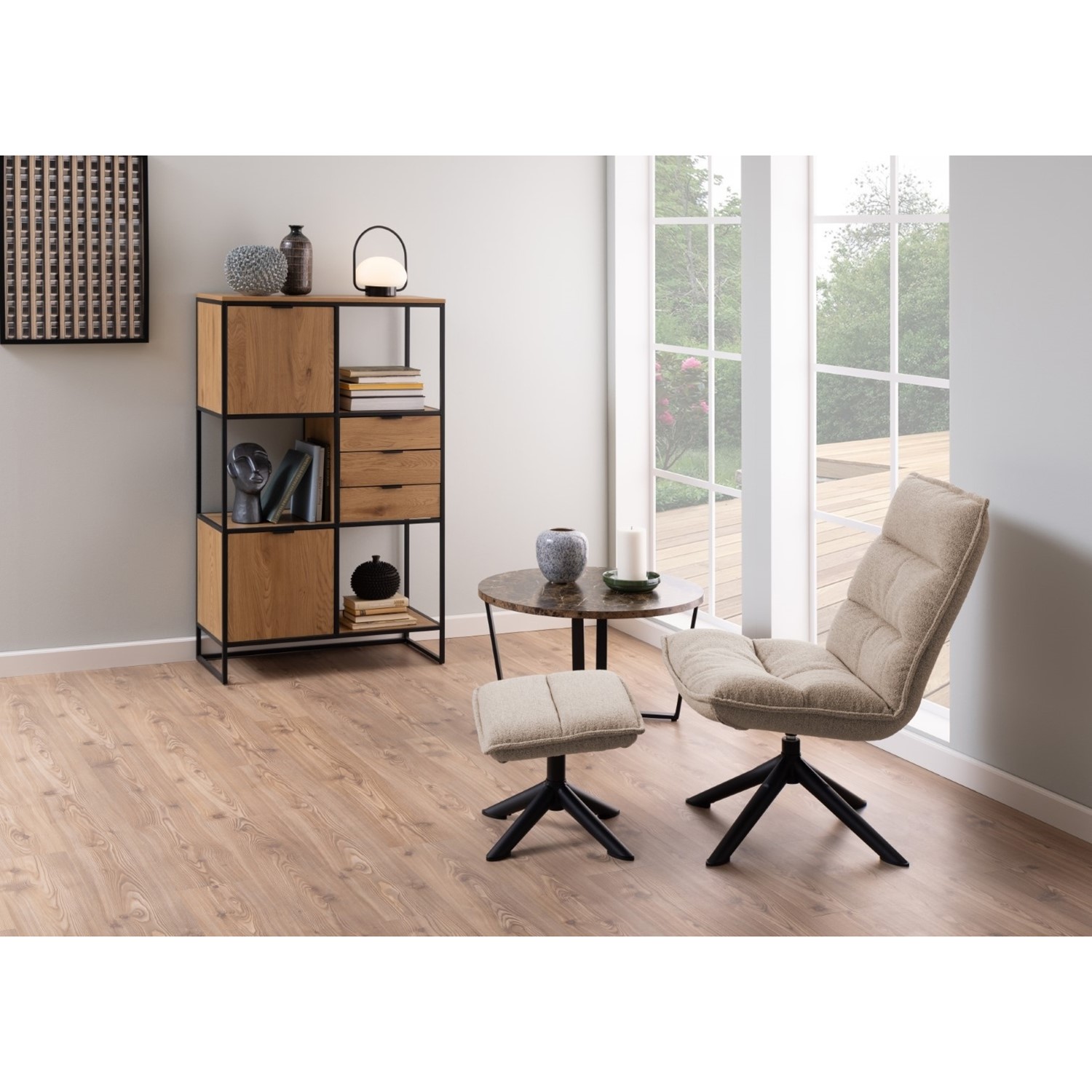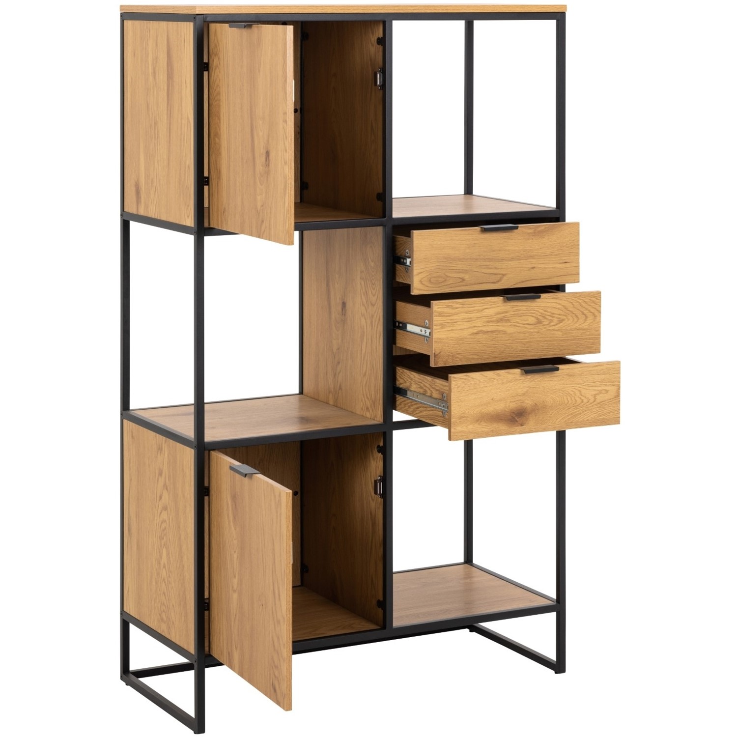Regał Swindon dąb to wszechstronny mebel idealny do biura, salonu, sypialni lub przedpokoju. Jego estetyczny i przyjazny dla oka design doskonale wpasuje się w nowoczesne i industrialne wnętrza. Regał posiada solidny szkielet z malowanego proszkowo metalu oraz elementy z laminowanej płyty MDF w kolorze drewna. Wyposażony jest w dwie szafki, trzy szuflady i trzy półki, co zapewnia dużo miejsca do przechowywania książek, obrusów i innych codziennych przedmiotów. Odkryte półki są idealne do eksponowania ulubionych pamiątek i roślin. Dzięki odpowiednio ustawionym nogom, łatwo utrzymać czystość pod meblem. Regał Swindon łączy w sobie funkcjonalność i elegancję, stając się piękną ozdobą każdego pomieszczenia.