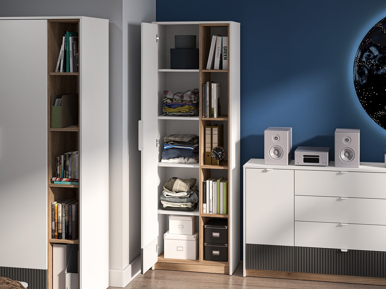 Regał to funkcjonalny mebel, który doskonale sprawdzi się w każdym wnętrzu. Wykonany z wysokiej jakości płyty laminowanej, regał charakteryzuje się trwałością i odpornością na uszkodzenia. Dzięki obrzeżom ABS, jego krawędzie są zabezpieczone przed zarysowaniami i uszkodzeniami mechanicznymi, co zapewnia długotrwałe użytkowanie. Regał oferuje przestronność, idealną do przechowywania książek, dekoracji czy innych przedmiotów, a jego nowoczesny design wkomponuje się w różnorodne aranżacje wnętrz.