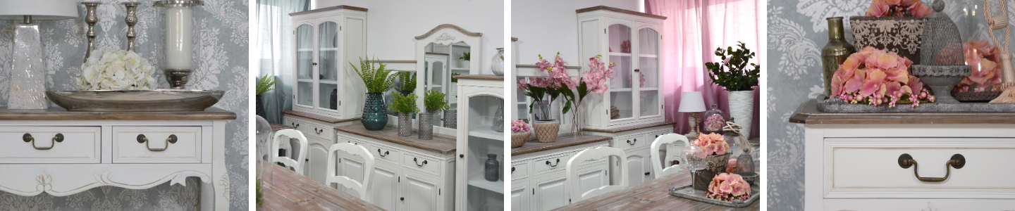 Harmonia stylu francuskiej elegancji z elementami prowansalskiego uroku stworzyły niezwykle ciekawy efekt finalny. Wykorzystaj go, zdobiąc swoje wnętrza. Przełamanie bieli brązowym, przecieranym i bielonym blatem lub w przypadku szaf oraz luster - wieńcem to akcent, który osobom nieprzekonanym do białych mebli prowansalskich nie pozostawi argumentów. Dodatkowo czarne, metalowe uchwyty są dopełnieniem ich nietuzinkowego designu, które docenią wszyscy miłośnicy stylowych detali.