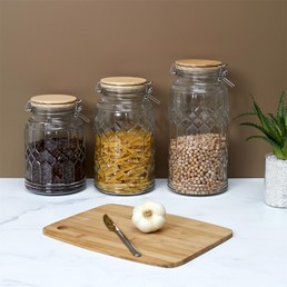 do każdej kuchni. Wykonany z wysokiej jakości szkła, umożliwia łatwe monitorowanie zawartości. Transparentny design sprawia, że słoik prezentuje się nowocześnie. Pokrywka z naturalnego bambusa, wyposażona