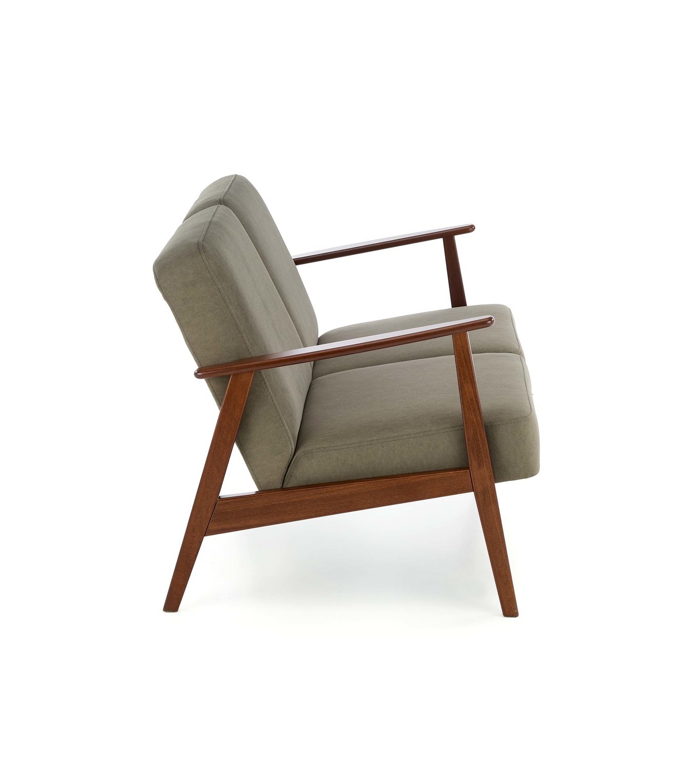 Sofa MILANO 2S to połączenie stylu i wygody. Wykonany z solidnego drewna bukowego oraz pokryty tkaniną CASTEL w kolorze oliwkowym, doskonale komponuje się z klasycznymi wnętrzami. Wykończenie w ciemnym orzechu dodaje mu elegancji i trwałości.