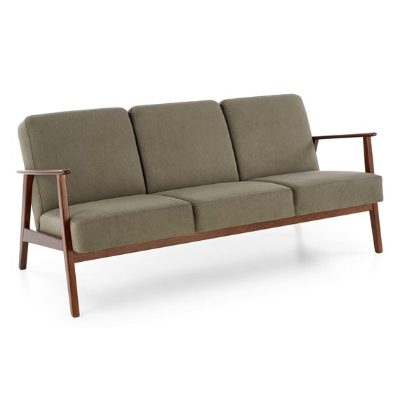 Sofa MILANO 3S to połączenie stylu i wygody. Wykonana z solidnego drewna bukowego oraz pokryta tkaniną CASTEL w kolorze oliwkowym, doskonale komponuje się z klasycznymi wnętrzami. Wykończenie w ciemnym orzechu dodaje jej elegancji i trwałości.