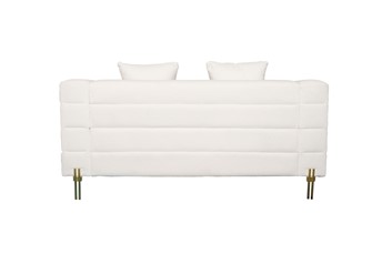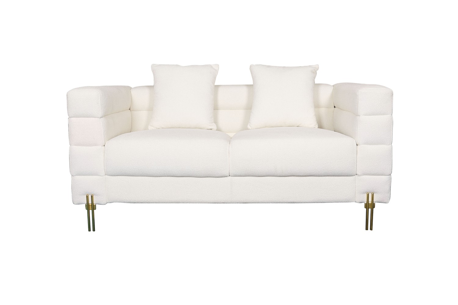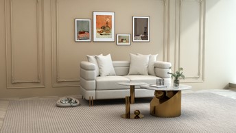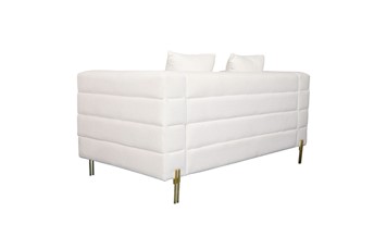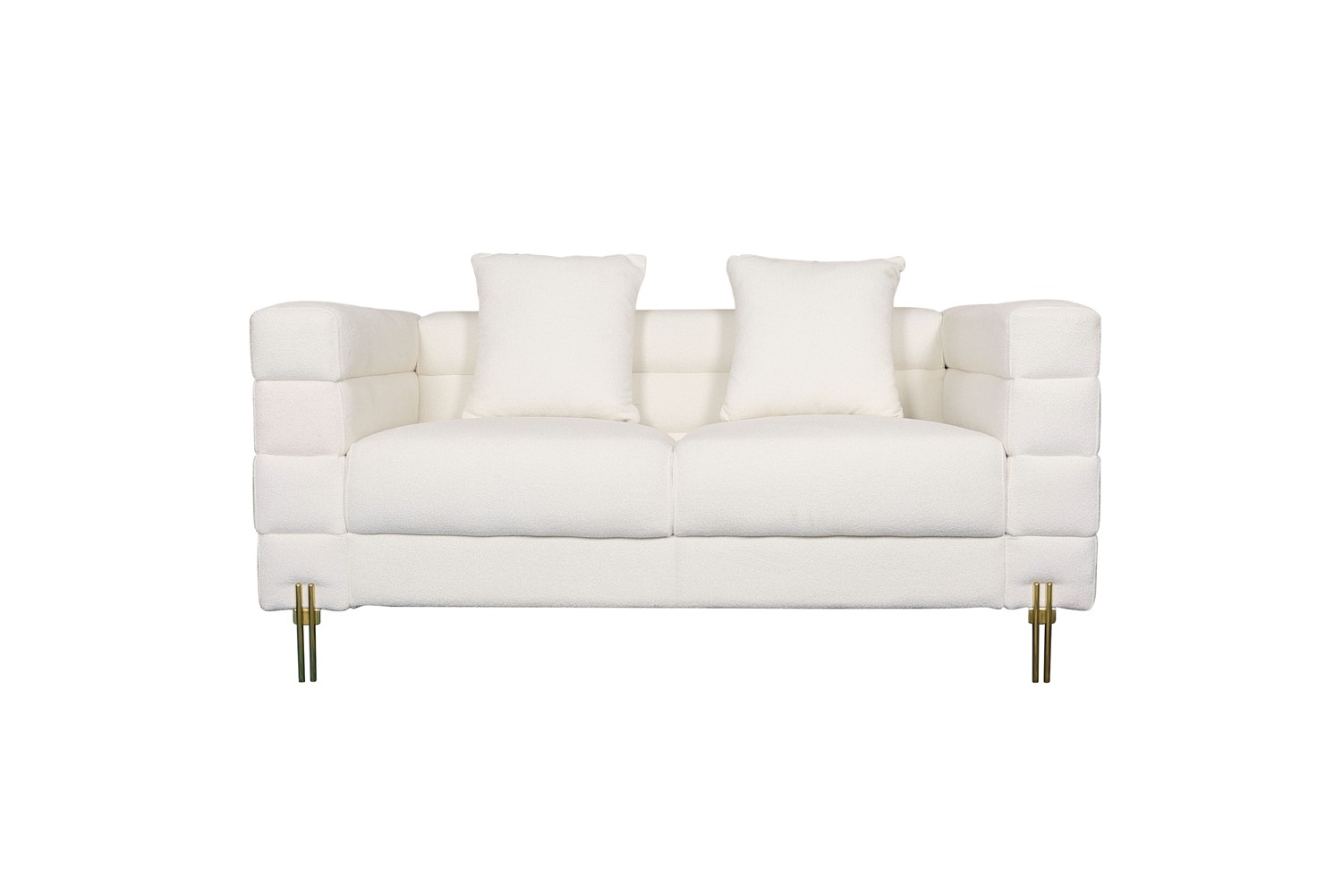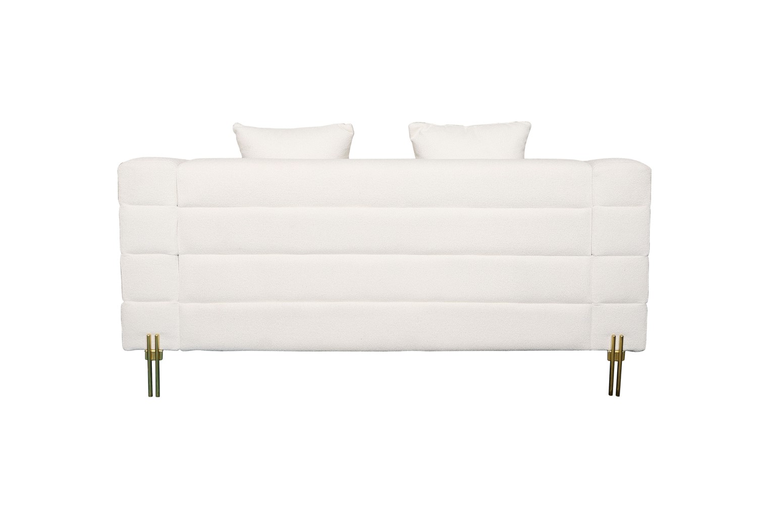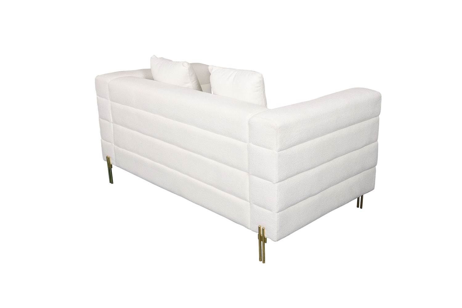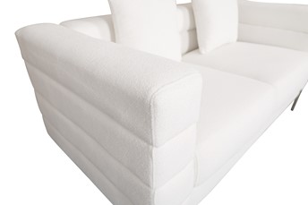 Elegancka i stylowa, ta dwuosobowa sofa to połączenie klasyki z nowoczesnością. Pokryta modną tkaniną boucle w delikatnym odcieniu złamanej bieli, zachwyca subtelnym urokiem i wyrafinowanym wyglądem. Jej nogi wykonane ze stali nierdzewnej w kolorze złotym dodają jej blasku i luksusowego charakteru. Klasyczny kształt sofy został wzbogacony o wysokiej jakości, miękką tkaninę, która zapewnia nie tylko wygodę, ale także elegancję w każdym detalu. Delikatne, poziome przeszycia nadają meblowi dodatkowego uroku, tworząc subtelny kontrast i podkreślając jego finezyjny charakter.