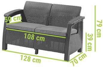Sofa 2-osobowa nie wymaga specjalnej impregnacji ani specjalnego czyszczenia. Materiały, z których wykonane są meble to wysokiej jakości polipropylen o wzorze brązowego rattanu, który jest odporny na warunki atmosferyczne i promieniowanie UV. Dzięki zastosowaniu specjalnych filtrów sofa będzie cieszyć oko przez wiele lat bez uszkodzeń i przebarwień. Poduszki posiadają zamki błyskawiczne, dzięki czemu można je łatwo zdjąć i wyprać. Z sofy Corfu Love można korzystać wyłącznie w sezonie wiosenno-letnim. Na zimę wystarczy zabezpieczyć go np. kocem lub plandeką. Ten mebel ogrodowy zapewnia wysoki komfort dzięki specjalnie wyprofilowanym oparciom, wygodnym szerokim podłokietnikom oraz niestandardowym poduszkom o grubości 6 cm. Dodatkowym atutem są nóżki sofy, dzięki którym można ją postawić nie tylko na twardym podłożu, ale również na ziemi.