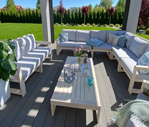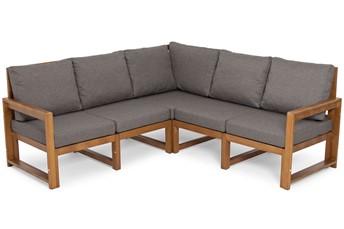 Minimalistyczny narożnik ogrodowy w kolorze jasnego brązu został zaprojektowany i wykonany w Polsce z najwyższej jakości materiałów. Meble ogrodowe z serii MALTA charakteryzują się solidnym wykonaniem i dużą wytrzymałością. Sofa w stylu skandynawskim idealnie sprawdzi się na balkonie, tarasie czy w ogrodzie. Stelaż wykonany z drewna z certyfikatem FSC, które jest impregnowane, a następnie lakierowane, odporne na warunki atmosferyczne i pleśń. Drewniane meble ogrodowe z powodzeniem można ustawić w nasłonecznionym miejscu, ponieważ nie pogarsza to ich funkcji. Narożnik składa się z pojedynczych modułów, dzięki czemu można go dostosować do własnych potrzeb. W zależności od konfiguracji elementy serii mogą służyć do budowy narożników prawych lub lewych. Każda część składa się z szerokiego siedziska, oparcia i środkowych nóżek. W skład zestawu wchodzą 4 moduły, moduł narożny, dwa wsporniki boczne oraz poduszka.