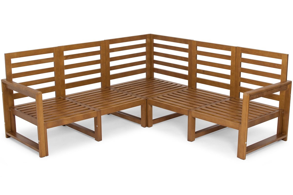 Minimalistyczny narożnik ogrodowy w kolorze jasnego brązu został zaprojektowany i wykonany w Polsce z najwyższej jakości materiałów. Meble ogrodowe z serii MALTA charakteryzują się solidnym wykonaniem i dużą wytrzymałością. Sofa w stylu skandynawskim idealnie sprawdzi się na balkonie, tarasie czy w ogrodzie. Stelaż wykonany z drewna z certyfikatem FSC, które jest impregnowane, a następnie lakierowane, odporne na warunki atmosferyczne i pleśń. Drewniane meble ogrodowe z powodzeniem można ustawić w nasłonecznionym miejscu, ponieważ nie pogarsza to ich funkcji. Narożnik składa się z pojedynczych modułów, dzięki czemu można go dostosować do własnych potrzeb. W zależności od konfiguracji elementy serii mogą służyć do budowy narożników prawych lub lewych. Każda część składa się z szerokiego siedziska, oparcia i środkowych nóżek. W skład zestawu wchodzą 4 moduły, moduł narożny, dwa wsporniki boczne oraz poduszka.